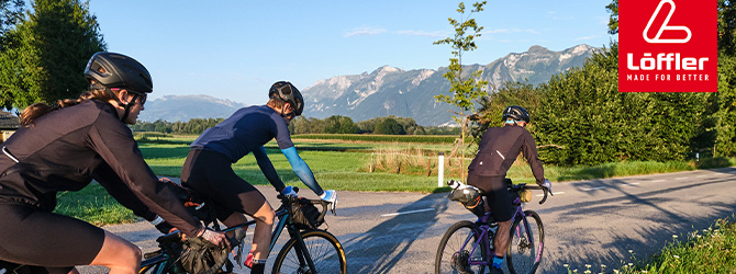 Mit einem Team aus drei Personen sind wir die 481 Kilometer und 7.882 Höhenmeter nachgefahren, die das neues Material transtex Shell zurücklegt, um bei Löffler in Ried im Innkreis zu einer fertigen Radjacke verarbeitet zu werden. Lisa, Nils und Oliver haben den Weg mit ihren Gravel-Bikes auf sich genommen. Begleitet werden sie auf ihrer Fahrt von einem Fotograf und einem Kameramann – ebenfalls per Rad.