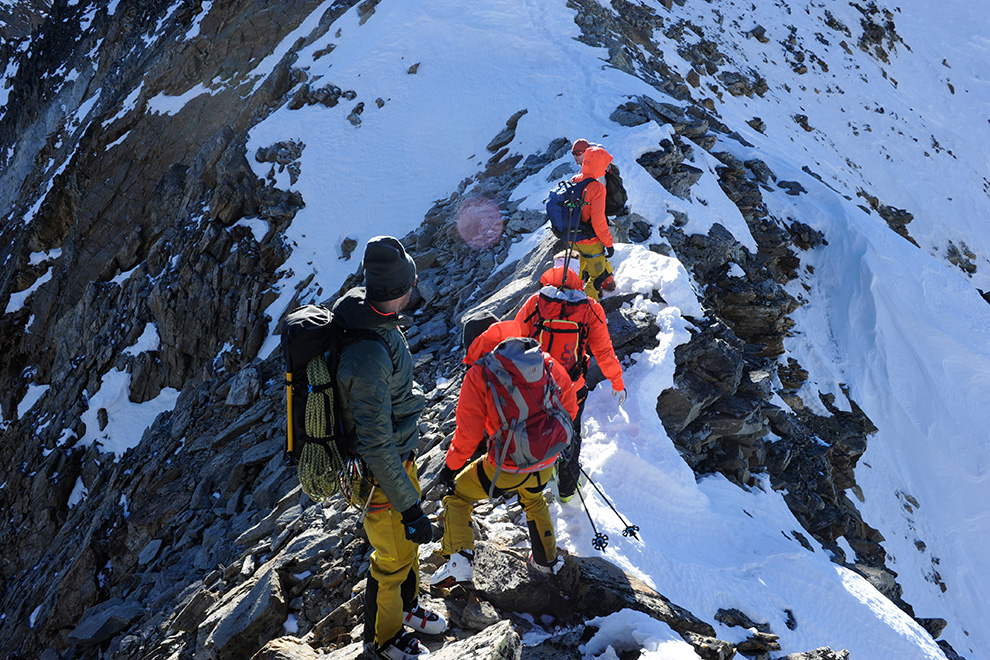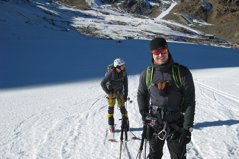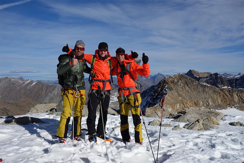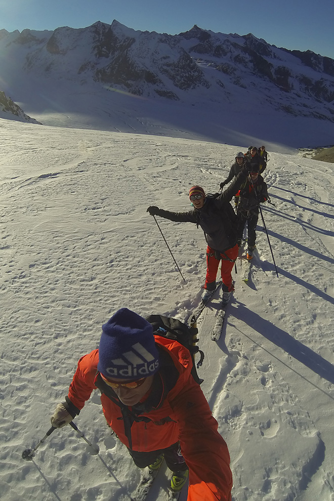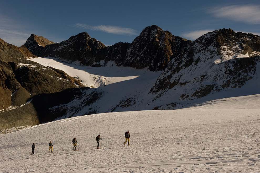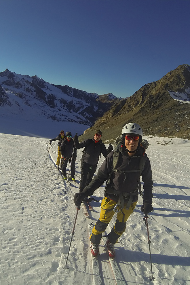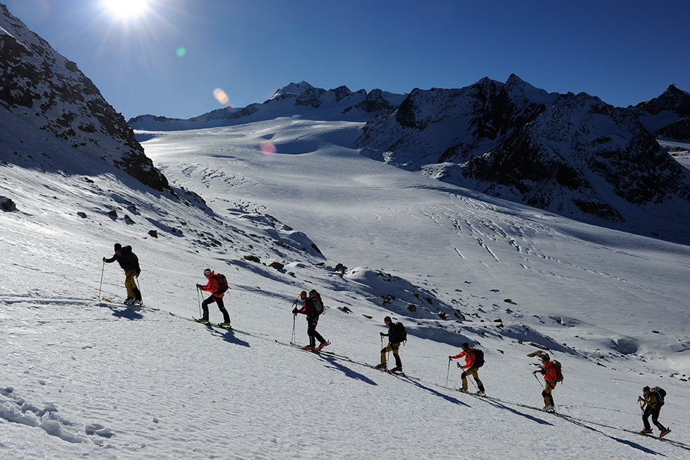 Leider hat es auch im Pitztal zu diesem Zeitpunkt noch nicht richtig geschneit und dementsprechend sind die Schneeverhältnisse eher dürftig. Doch selbst harter Altschnee und Bruchharsch können die Motivation der Gruppe nicht brechen. Als wir anschließend unsere Gletschertour starten, steigen wir als Seilschaft auf, denn es ist immer auch mit Spalten zu rechnen. Im gemeinsamen Takt geht es bei prallem Sonnenschein und Kaiserwetter unserem Gipfel entgegen.