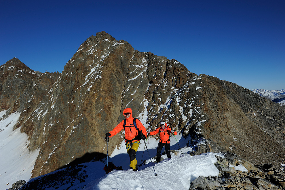So langsam kommt die Sonne raus, wir machen einen ersten Halt. Es wird warm, also Hardshelljacke ausziehen und Sonnenbrille auf die Nase setzen. Dem Gletscher folgend steigen wir immer höher, vor uns erstreckt sich ein Panorama wie aus dem Bilderbuch. Bald haben wir unser Tourenziel erreicht und nach einer kurzen Gipfelrast heißt es wieder abfahren. Wie bereits am Vortag sind auch jetzt die Bedingungen nicht gerade gut und so mancher unerwünschte Schneekontakt bleibt bei unserer Gruppe nicht aus. Doch auch hier halten die Hardshelljacke sowie die Hose, was sie versprechen, und für Schnee und Nässe heißt es draußen bleiben.