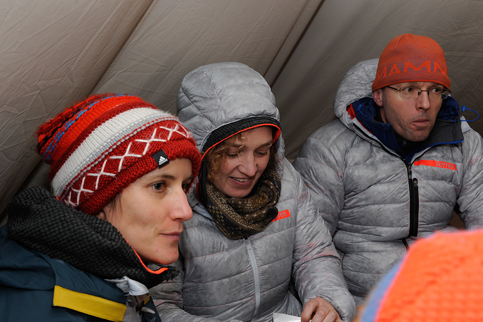 - Abends im Gletscher-Camp: Die Terrex Climaheat Agravic Daunenjacke im Einsatz