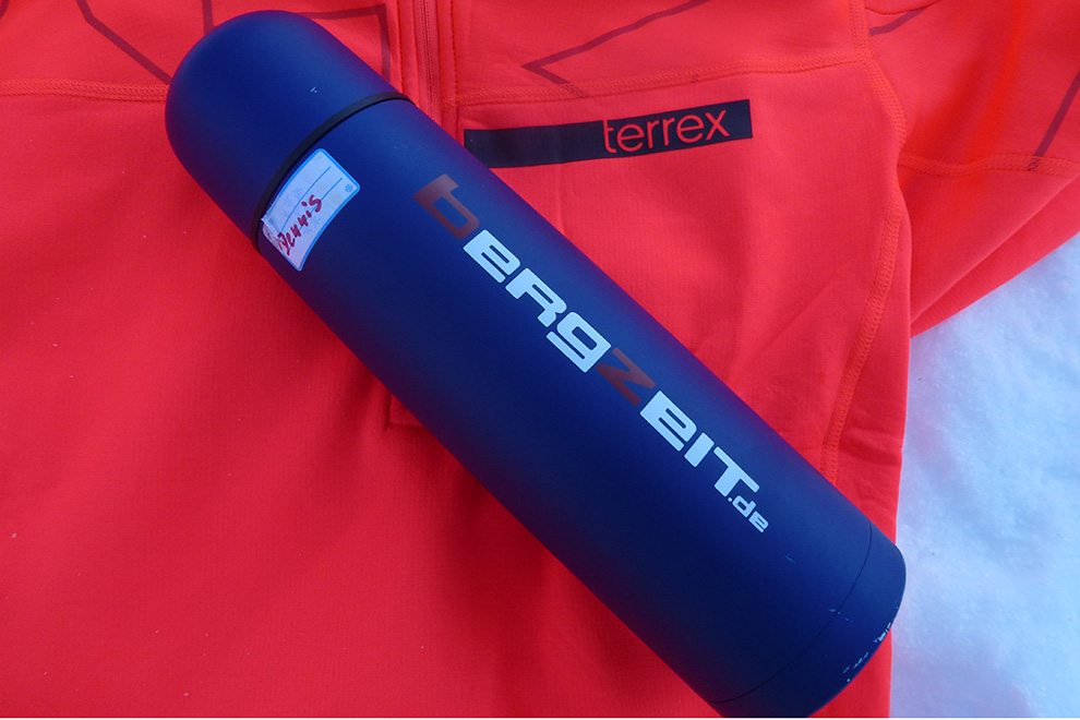 Oben angekommen geht es recht schnell. Aus dem Seil ausbinden, Felle vom Ski ziehen und einen Becher Tee trinken. Dieser ist in der original Bergzeit-Isolierflasche noch immer herrlich warm und somit für uns alle ein willkommener Pausentrunk. Kurz darauf geht’s auch schon wieder hinunter. Wie bereits erwähnt, ist die Schneelage nicht gerade die beste und die Abfahrt wird eher zum Kampf als zum erhofften Schneespaß.