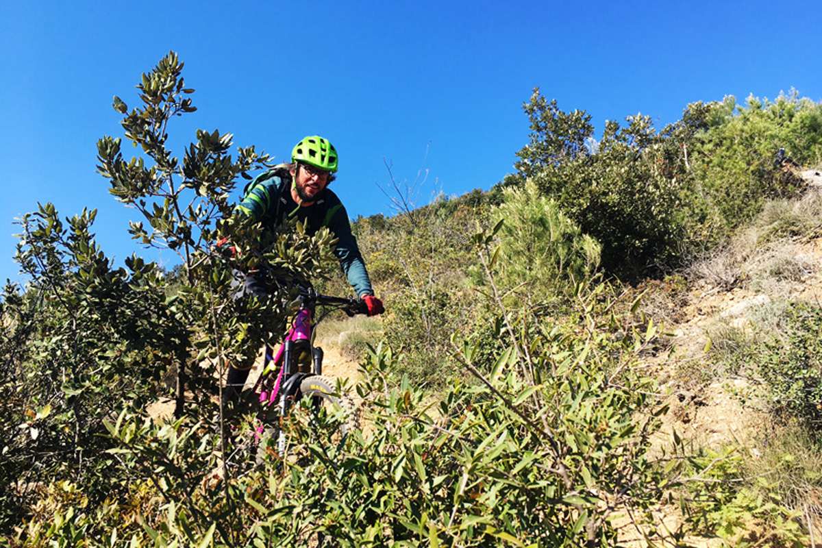 Im italienischen Mountainbike-Mekka Finale Ligure muss der adidas Terrex Trail Cross Protect beweisen, ob er auch im Bike-Alltag eine gute Figur macht. Das Gelände ist verblockt, der Trail rau. Jetzt bin ich direkt froh, dass der Schuh bis über den Knöchel geht. Und genau in diesem sensiblen Bereich des Fußes dick gepolstert ist!