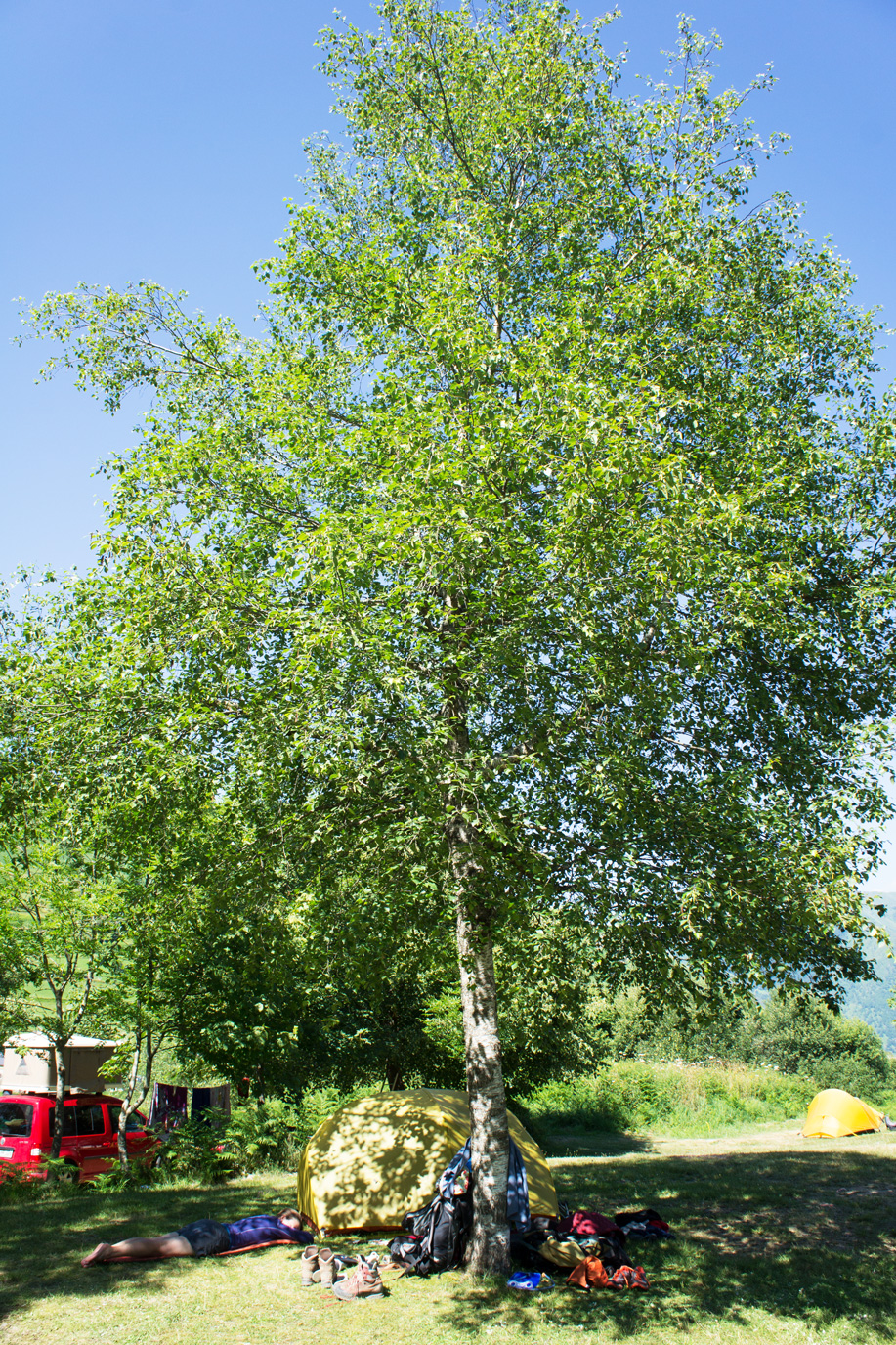 Zum Glück erreichen wir bald den Port de Larrau, einen Straßenpass kurz vor dem Pic d’Orhy. Aus der Ferne sehen wir, dass ein VW-Bus auf einem kleinen Parkplatz Halt gemacht hat. Es beginnt zu regnen, der Wind weht in harten Böen von Spanien her. Der Fahrer des VW gestikuliert – er will uns mitnehmen. Kurzentschlossen springen wir in den Bus – und treffen auf eine vierköpfige französische Familie auf dem Heimweg aus Spanien. Sie nehmen uns mit in den Talort Larrau, wo wir auf einem Campingplatz im Gewitter unser Zelt aufbauen uns es uns so gut wie möglich gemütlich machen. Besser als auf dem Bergkamm ist das hier allemal!