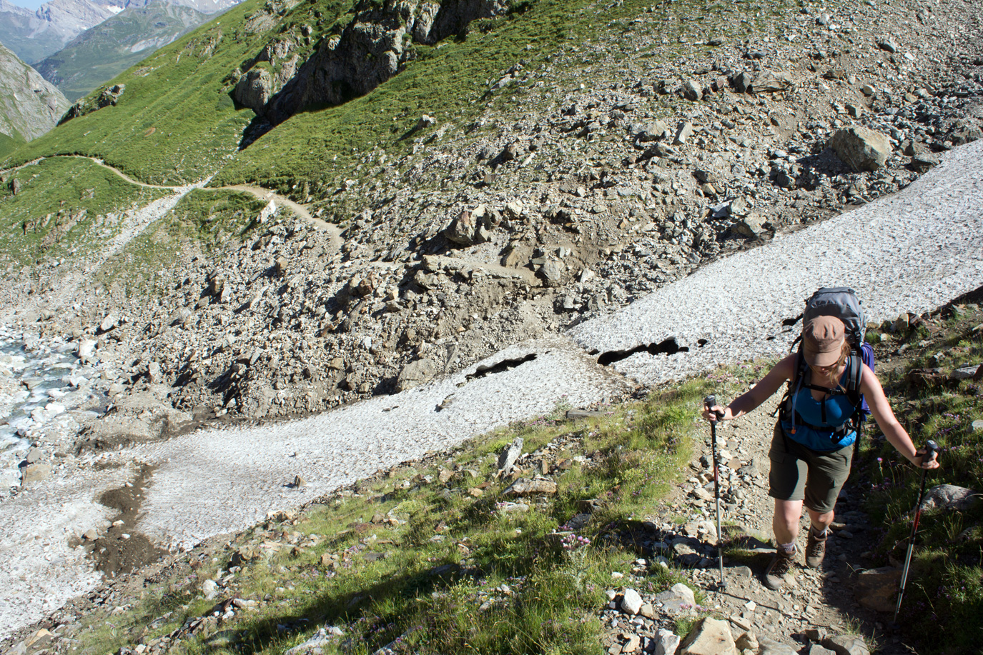 Zunehmend steil führt der Pfad durch grobes Blockwerk zum Col d’Arremoulit. Unsere Rucksäcke drücken gnadenlos auf die Schultern. Wir geben alles, um an dieser Stelle nicht vor der HRP zu kapitulieren. Die Herausforderung alles, was man zum Bergleben braucht, auf dem Rücken tausende von Höhenmetern hochzuwuchten, ist nicht zu unterschätzen. Doch die Qual ist es wert, die Zeltplätze hier gehören zum schönsten, was ich in meinem bisherigen Bergsteigerleben erleben durfte.