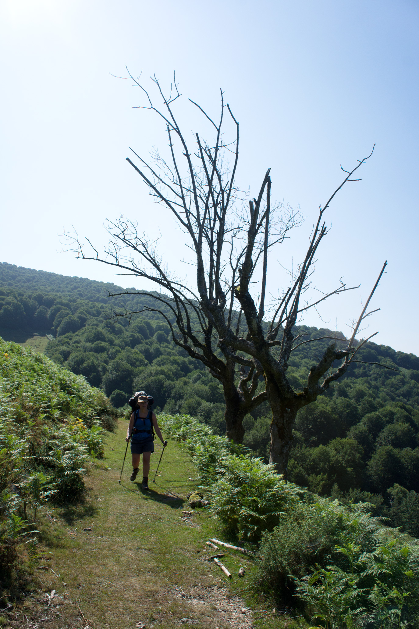 Auch mit scheußlichen Tagen muss man auf Weitwanderungen rechnen – der nächste ist ein solcher. Zunächst verlassen wir Larrau Richtung Col Bagargui durch ein pittoreskes Tal. Schließlich geht es recht steil nach oben. An den sonnenbeschienenen Berghängen ist es schwülwarm, der Regen der vergangenen Stunden steigt als Wasserdampf durch den mannshohen Farn.