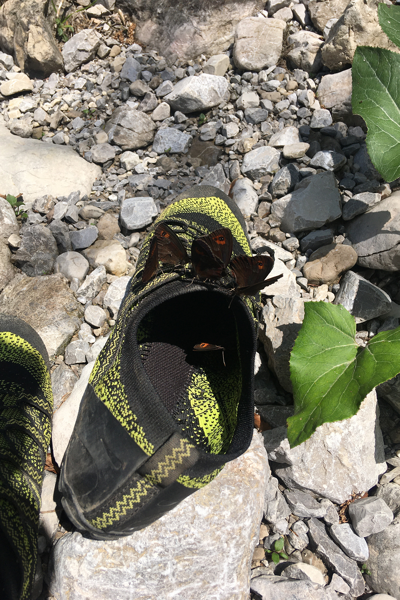 Ein anderes Mal – der Zustieg ist hier kürzer – nutze ich die Schuhe direkt für den Zustieg. Das klappt wunderbar – allerdings merkt man hier schon, wie die Schuhe bei feuchtem oder matschigen Untergrund an ihre Grenzen kommen. Rutschige Felsen sind nicht das Terrain des Schuhs. Und als ich auf dem Rückweg tollpatschig mit einem Schuh in einem Matschloch lande, lerne ich: Wasserdicht sind sie nicht (hat aber auch nie jemand behauptet).