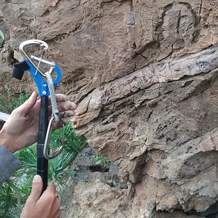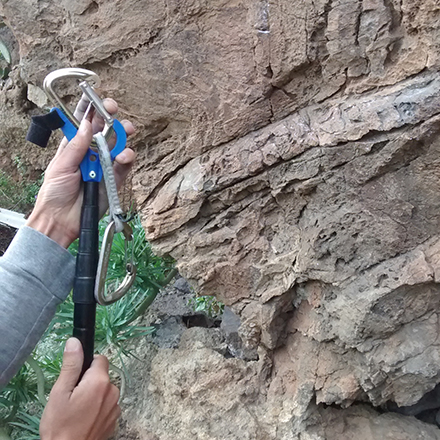 Gerade mit älteren Expressen verweigert der Clipstick seine Zusammenarbeit. Am besten funktionieren Karabiner, deren Schnapper breiter ist als ihr Rücken. Wie zum Beispiel alle gängigen Wiregate-Karabiner. Im Lieferumfang enthalten ist eine Metolius M16 Griffbürste. Diese wird in einen Schlitz am Kopf des Betasticks gesteckt und mit dem Klettband (das ebenfalls am Kopf des Sticks zu finden ist) fixiert. Damit kann überschüssiges Magnesia oder Dreck, der sich nach den langen Wintermonaten am Fels sammelt, entfernt werden. Die Bürste liegt schräg im Clipstick, um das Putzen von Leisten und Auflegern zu optimieren. Es gilt dasselbe zu beachten wie beim Vorclippen: Höchstens die ersten zwei bis drei der Elemente ausfahren! Die Druckkraft schwindet mit jedem Zentimeter und die Griffe lassen sich kaum noch säubern. Es fühlt sich an, als ob man versucht, mit einer Angel und einer Bürste am Ende die Zähne zu putzen – ich würde ausschlagen! Auch hilft der BetaStick, die Verwüstungen am Felsen in Grenzen zu halten. Dann hat man den Stick dabei, muss man keine jungen Bäume mehr absägen oder abbrechen (wie man es ja leider oft sieht), um sich einen provisorischen Clipstick zu basteln oder einen hohen Griff zu bürsten.