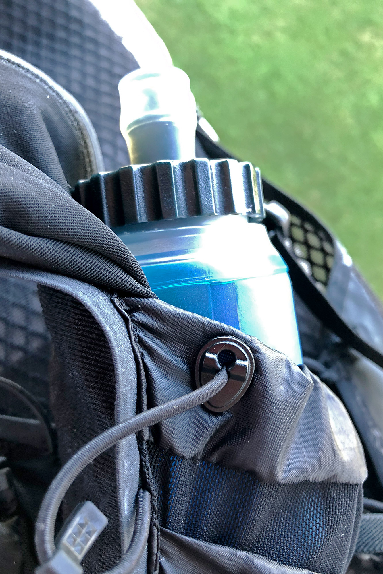An den Schulterträgern befindet sich auf jeder Seite jeweils eine elastische Reißverschlusstasche. Darunter noch zwei Fächer mit elastischem Verschluss. Eines speziell für die Softflask, das andere für die restliche Nahrung. So clean und aufgeräumt das Hauptfach ist, desto variabler sind die Verstaumöglichkeiten an den Schulterträgern.