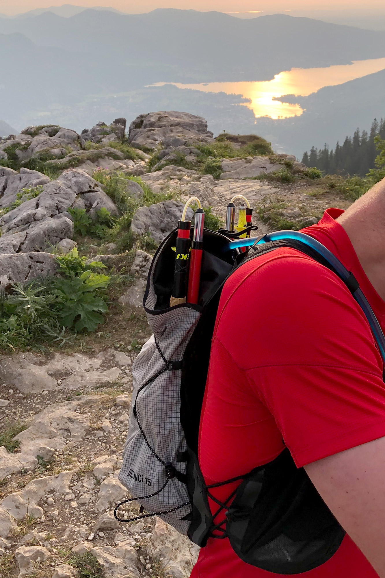 Beim Packen für den ersten längeren Lauf mit dem Distance 15 wird schon deutlich, dass es sich hier um einen Hybridrucksack handelt. Er fühlt sich auf gemäßigten Trails im Alpenvorland pudelwohl, findet aber genauso nahtlos den Übergang in exponiertes hochalpines Gelände. So findet man an der Außenseite des Rucksacks zwei Halterungen für Eisgeräte sowie zwei komprimierbare Fächer für Faltstöcke. Gerade gegenüber reinen Trailrunningrucksäcken ist das ein klarer Vorteil. Und durch das seitliche Kompressionssystem lassen sie sich perfekt und ohne zu wackeln verräumen. Selten sind die Stöcke dort so sauber aufgeräumt. Der Nachteil ist hier nur, dass man sie nicht herausnehmen oder verstauen kann ohne den Rucksack abzunehmen. Also nichts für den Wettkampf, aber sehr schlicht und sauber gelöst. Wettkämpfe stehen auch definitiv nicht im Fokus des Distance 15, sondern lange und schnelle Solo-Unternehmungen am Berg, sozusagen Trailrunning mit alpinistischem Anspruch.