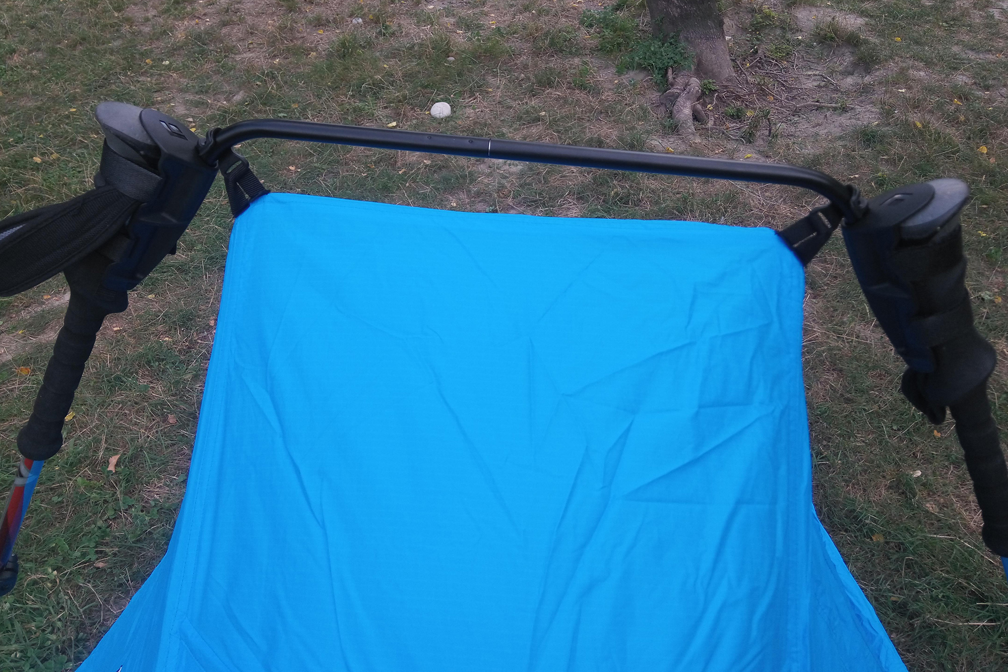 Die mitgelieferten Adapter zur Befestigung an den Trekkingstöcken sind schnell angebracht. In die Löcher des Adapters steckt man die Enden der Spreaderbar, also der Stange, die den Dachbereich des Zeltes ausspannt. Die Spitzen der Trekkingstöcke steckt man anschließend durch die Abspannschlaufen, klickt das Zelt in die Spreaderbar und bringt es auf Spannung, indem man die Stocklänge entsprechend anpasst. Für eine optimale Spannung empfiehlt Black Diamond eine Stocklänge von 120 bis 125 Zentimetern, bei mir waren es oft um die 127 Zentimeter.
