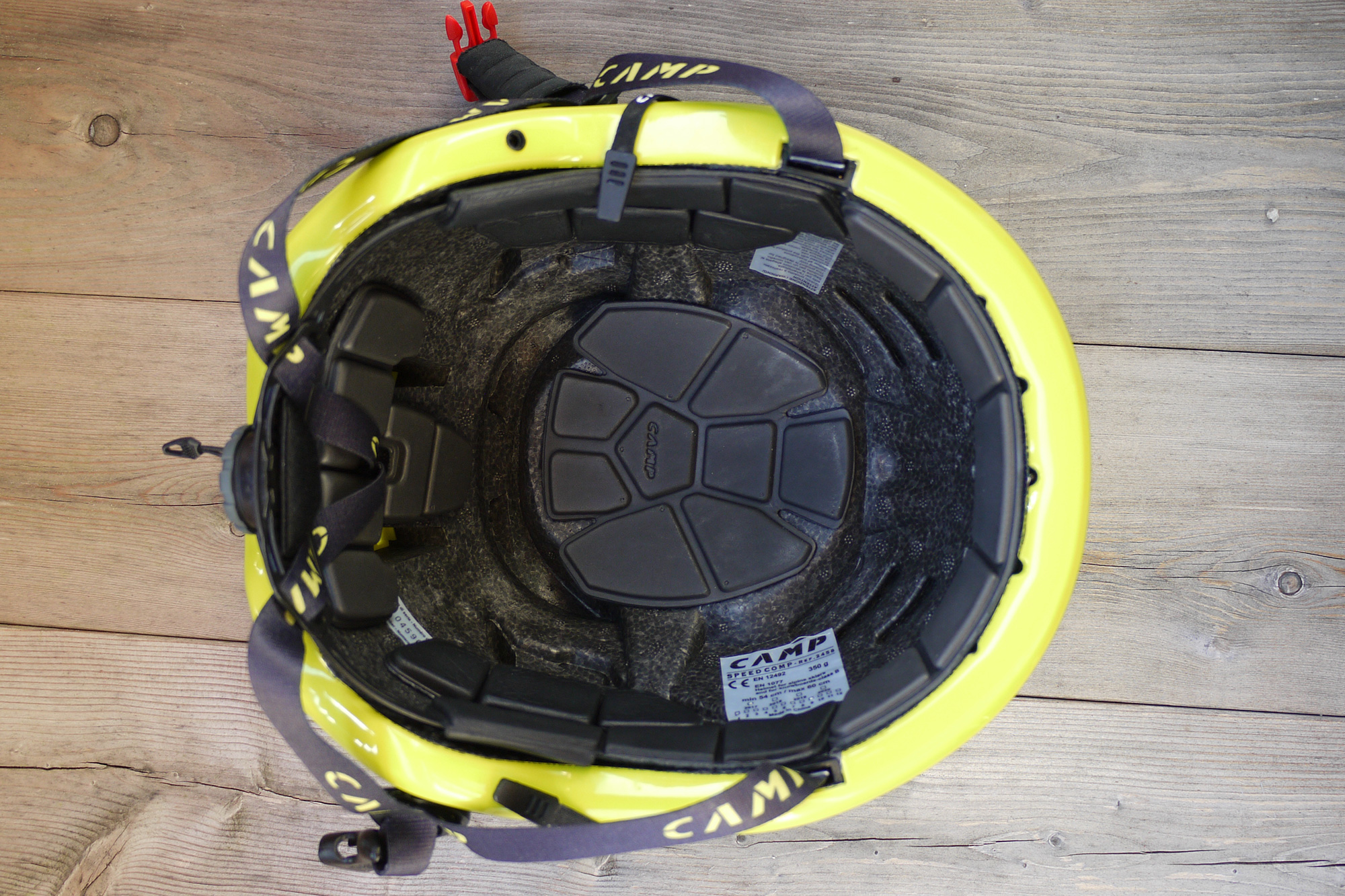 Wie sein Vorbild ist auch der Speed Comp in In-Mold Bauweise konstruiert. Den Kern des Helmes bildet eine EPS- Schicht (expandiertes Polystyrol), die die eigentliche Schutzwirkung garantiert. Ummantelt ist diese von einer Außenschale aus Polycarbonat. Die Kombination aus beiden Materialien macht den Helm besonders robust. Im Inneren kleidet Camp den Helm mit einer wasserabweisenden Schaumstoffpolsterung aus, die bei kalten Temperaturen durchaus Sinn macht.