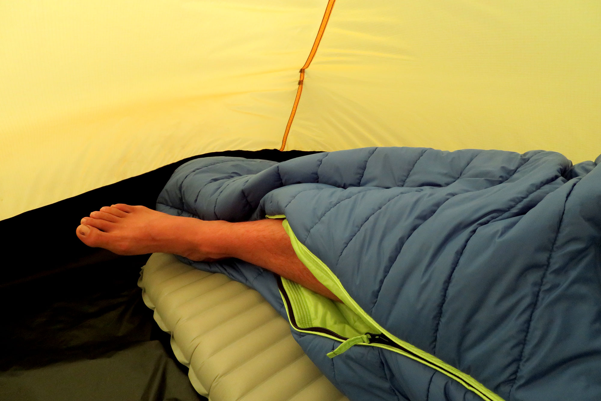 Im Vergleich zu anderen Schlafsäcken mit diesem Gewicht sind das sehr gute Werte – doch hier liegt der Teufel in der Praxis: Ich persönlich bin wirklich keine Frostbeule und konnte nur bis ca. +7 Grad komfortabel ohne Kleidung im Schlafsack schlafen – geschlossener Reißverschluss und Kapuze natürlich vorausgesetzt! Bei niedrigeren Temperaturen musste ich zusätzliche Kleidung, also Socken, Hose und Thermofleece-Oberteil anziehen, und bei Minusgraden noch eine weitere Jacke und Mütze. Noch dazu habe ich den Schlafsack sogar mit der Therm-a-Rest Neo X-Therm kombiniert, einer der besten Isomatten auf dem Markt.