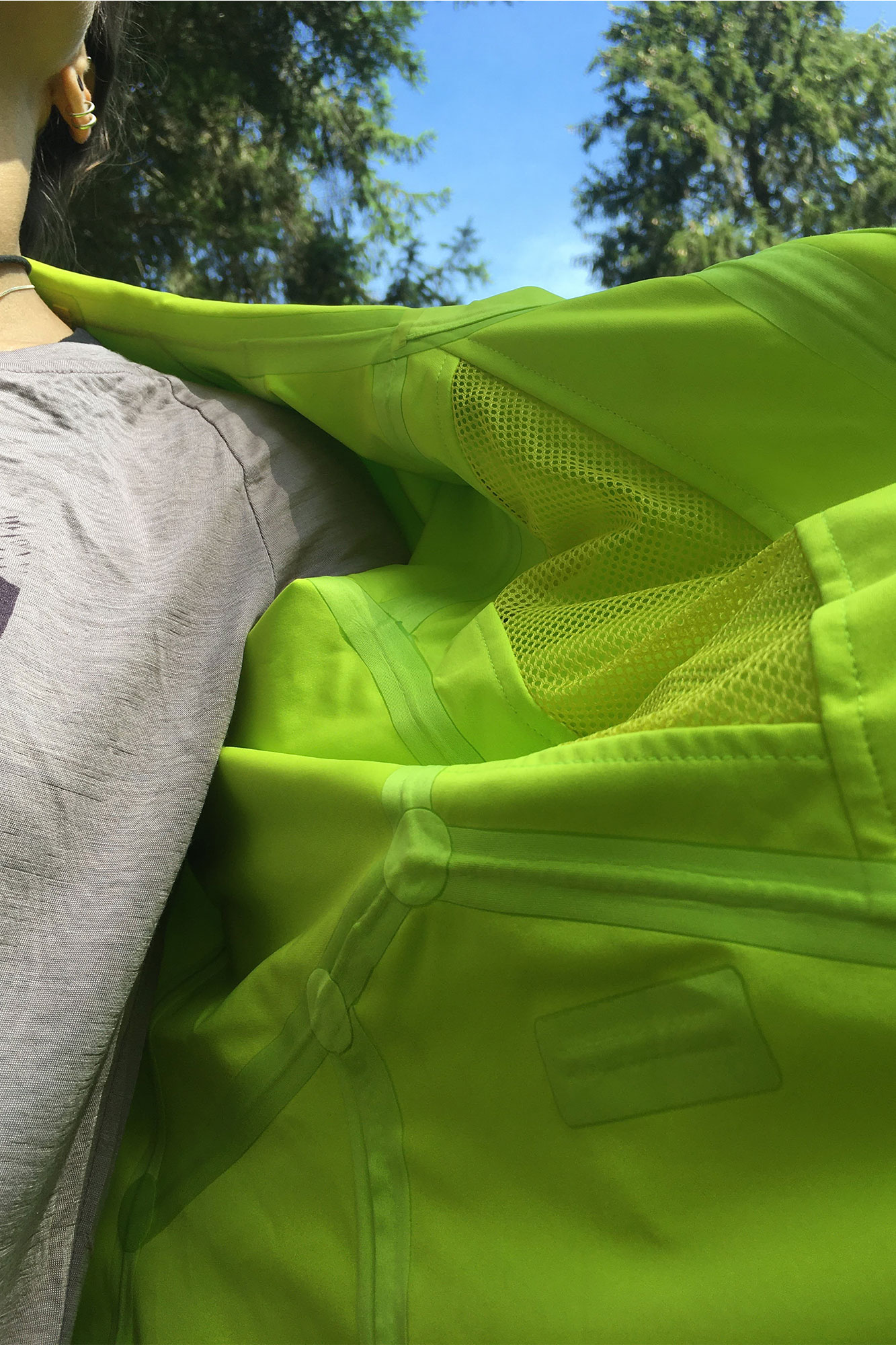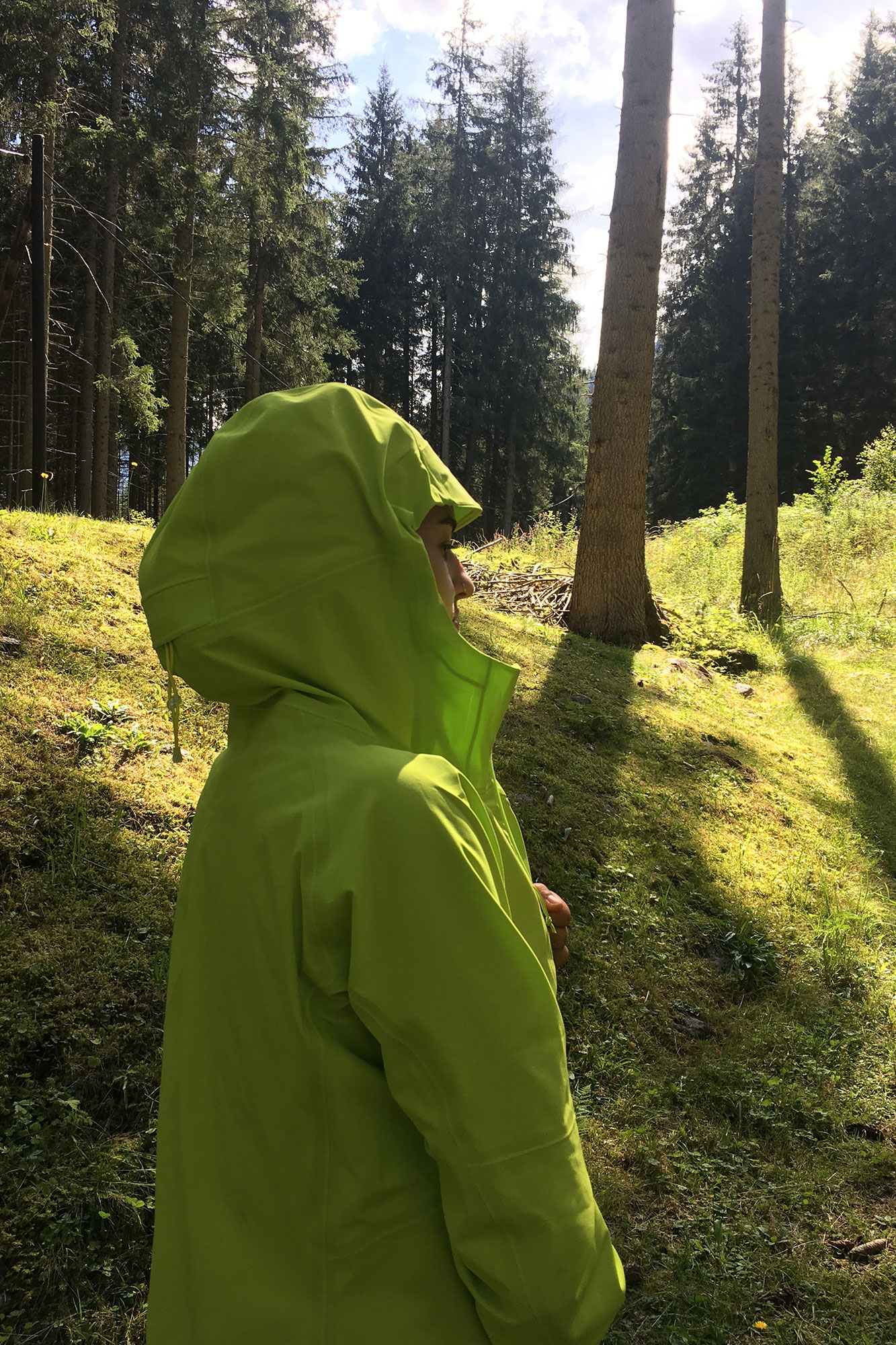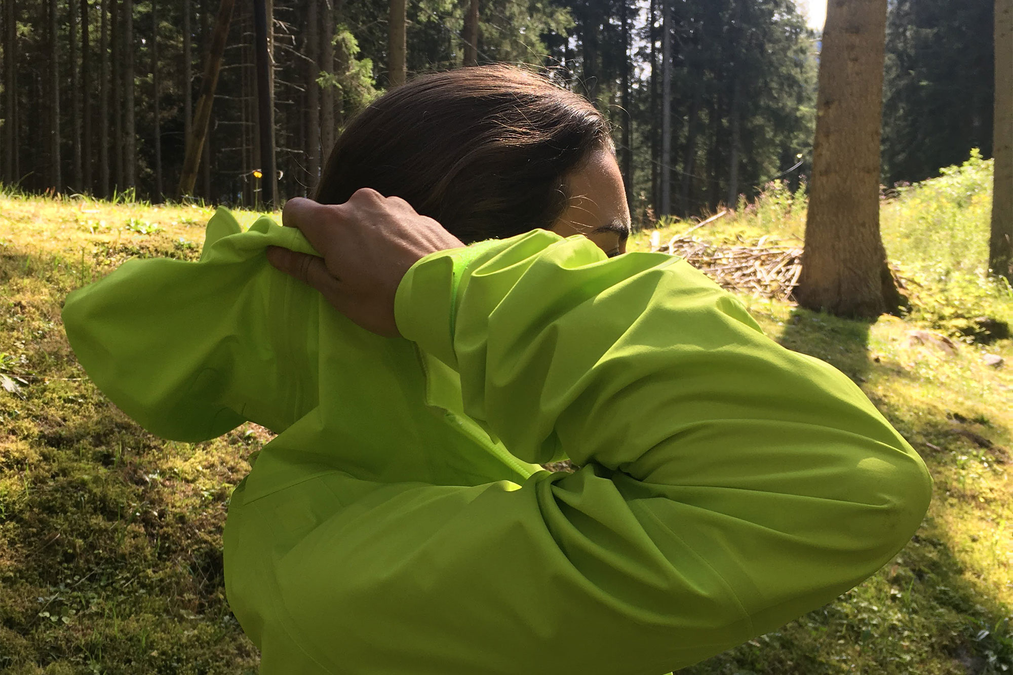 Die Farbe wird sicher nicht meine Lieblingsfarbe, jedoch finde ich es super, dass ich als kleiner Mensch so garantiert nicht mehr verloren gehe. Wenn ich durch den Wald streife, dann sieht man mich aus sehr weiter Ferne bereits in strahlendem Neon-grün. Die Jacke ist ein richtiger Allrounder. Sie dient als Regenjacke, Wanderjacke, Windbreaker und ist auch für alpinere Touren geeignet. Als pragmatischer Mensch freue ich mich über eine All-in-one-Jacke, die noch dazu leicht ist und klein verpackt werden kann.