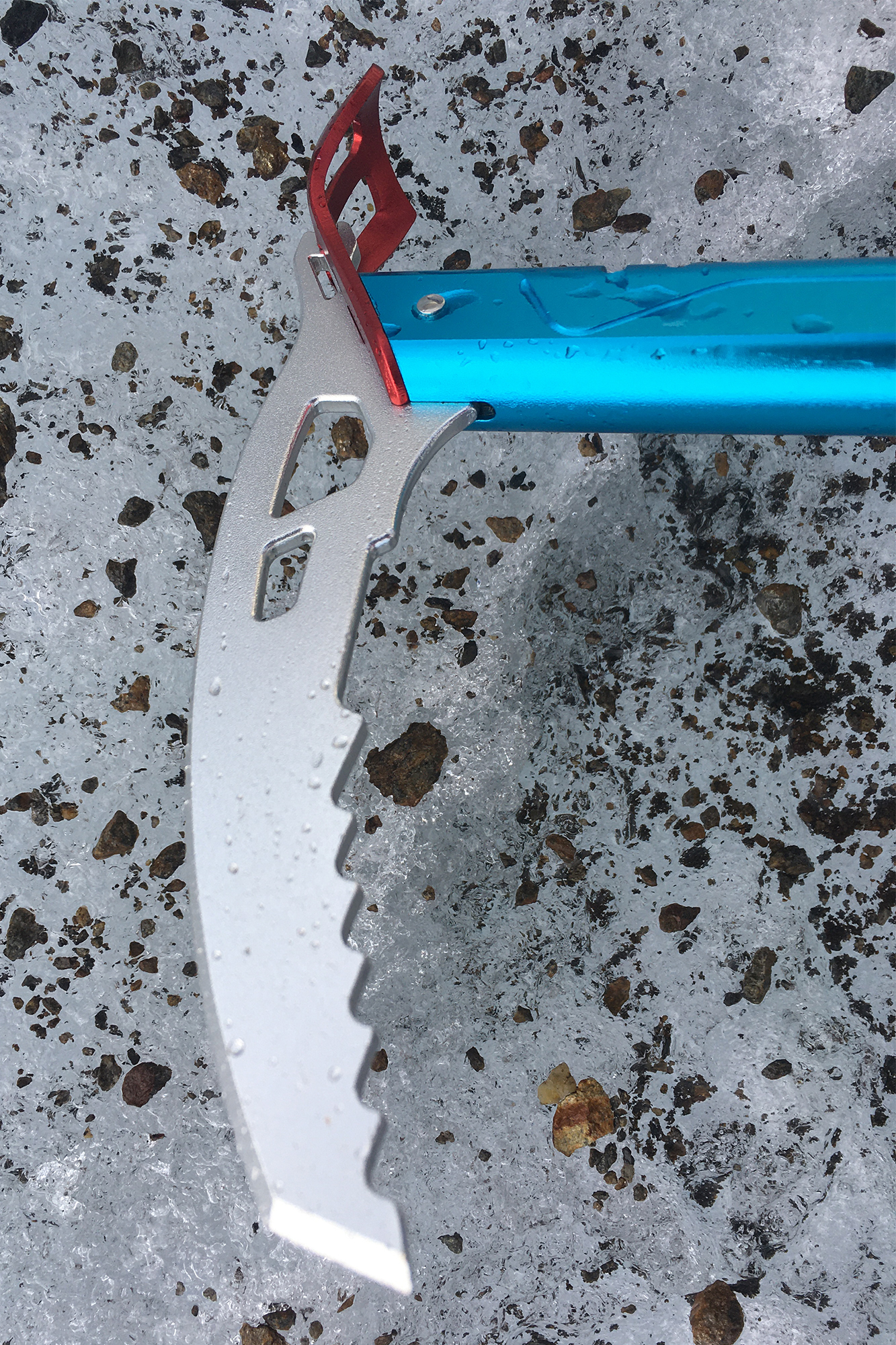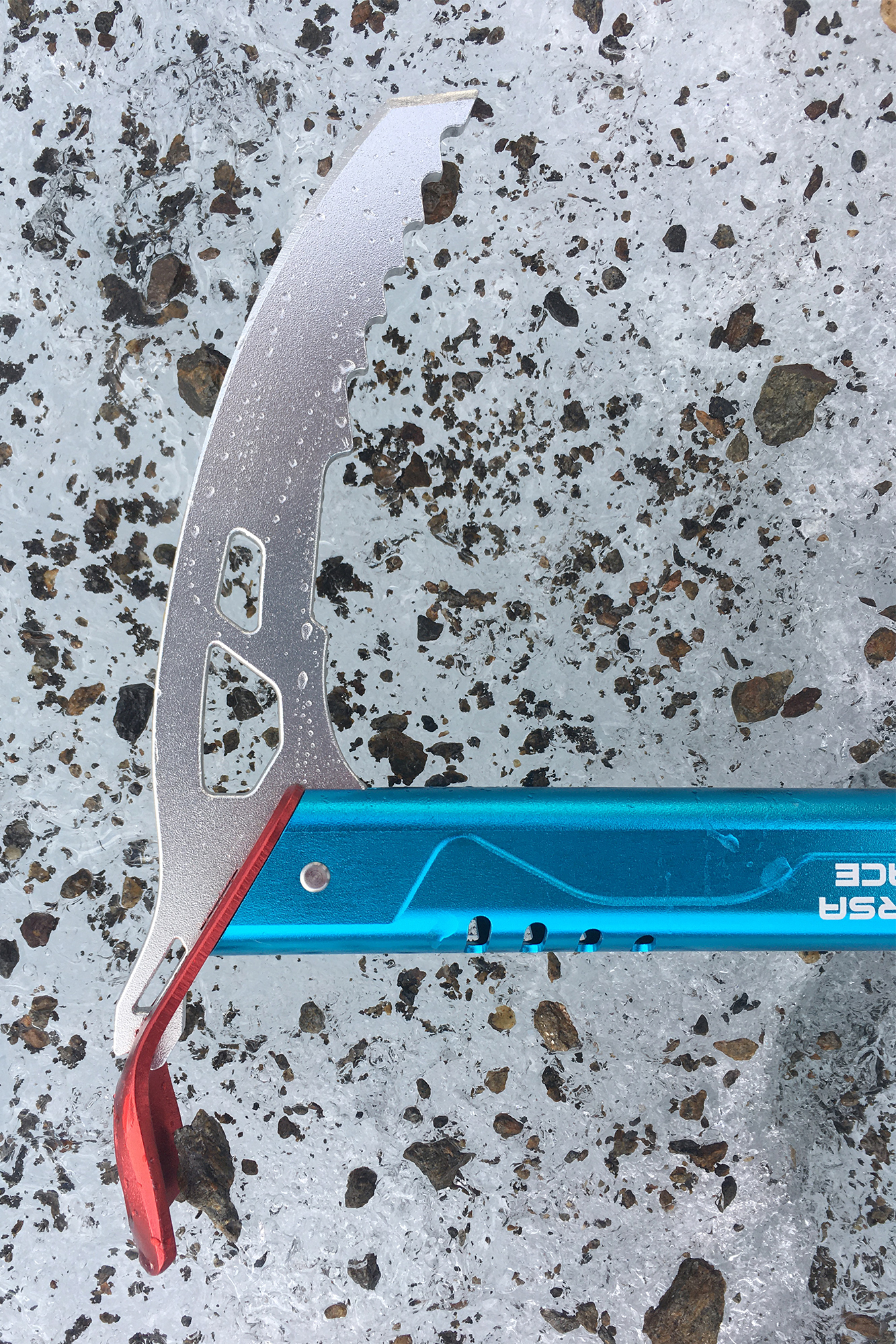 Sebastian: „Ein Race-Pickel ist extrem aufs das Gewicht getrimmt. Man muss bei ihm ganz klar Abstriche in Bezug auf Handling und Haltbarkeit machen. Oft haben diese entweder eine reine Aluhaue, verkraften also Felskontakt nicht wirklich gut auf Dauer. Der Camp Corsa Race hat zwar eine Stahlverstärkung, trotzdem wird der Kopf durch den Großteil des verwendeten Alus extrem leicht. Dadurch fehlt ihm der „Zug“, wenn man ihn ins Eis hauen möchte. Er springt leichter weg und greift nicht wirklich gut. Für den „normalen“ Skitourengeher ist es eher ein Notpickel. Wenn man weiß, dass man sicher einen Pickel braucht, würde ich immer einen mit Stahlhaue bevorzugen.“