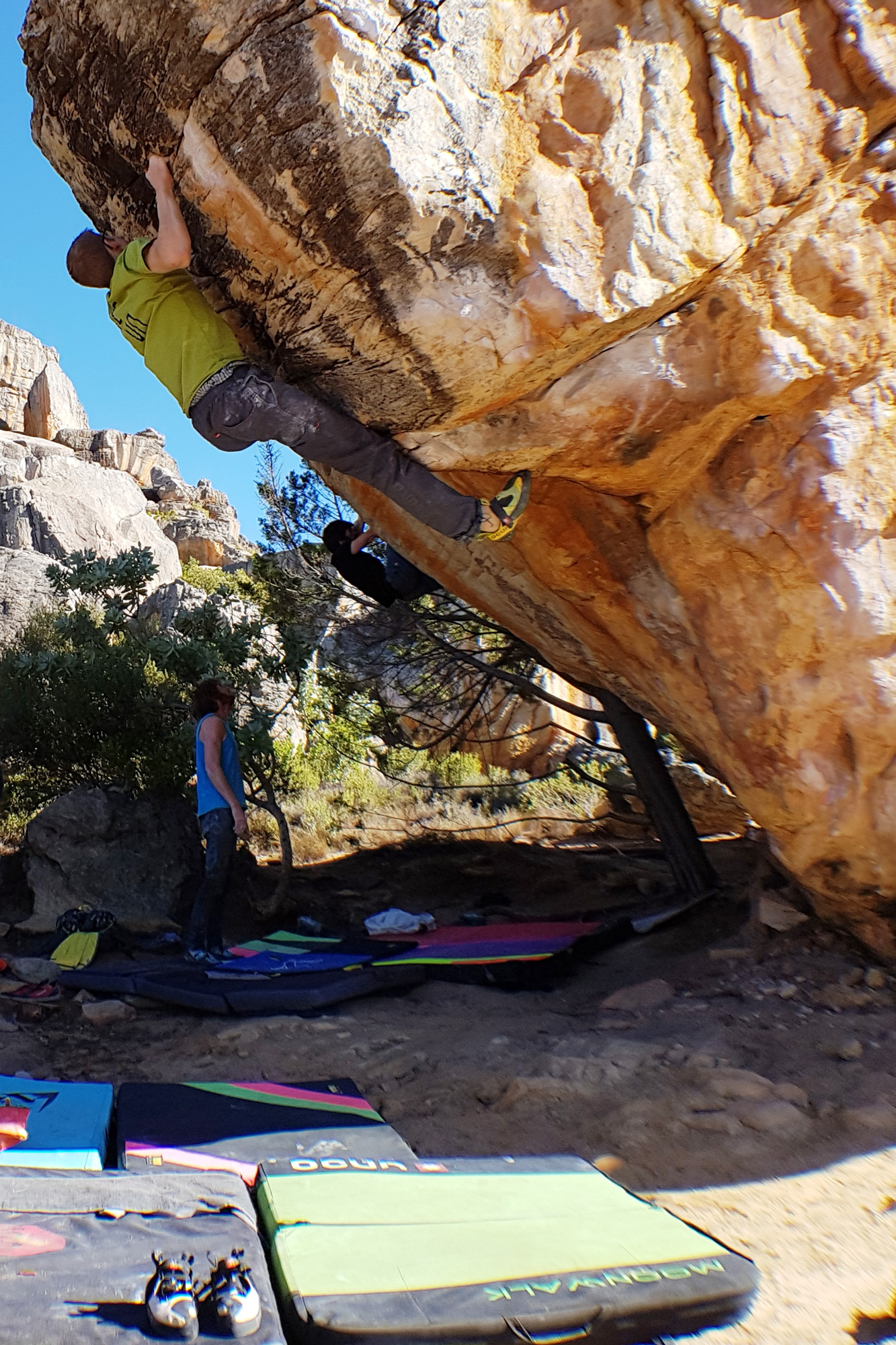 - Das Crashpad lässt sich aber auch der Länge nach ausklappen. Damit sind auch lange Traversen ausgezeichnet abzuzsichern. Alleine mit dem Moonwalk, dem Ocun Sitpad und einer kleinen Zusatzmatte konnte ich in die zehn Meter lange Straßenblocktraverse (FB 8A Trav.) alleine und ganz ohne Spotter klettern! Außerdem habe ich das Crashpad in der Längsfunktion schon einige Male als Matratze verwendet. So konnte ich das Gepäck für meine Boulderurlaube um eine zusätzliche Isomatte reduzieren. Das hat sich insbesonders für meine Reise in die Rocklands angeboten. Durch die Gepäckbestimmungen am Flughafen hieß es Gewicht sparen, wo es nur möglich war.