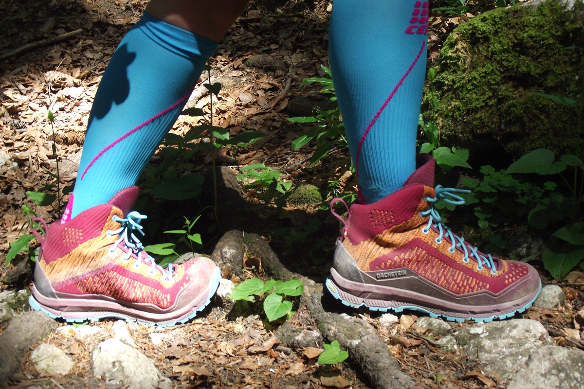 Es braucht eine ganze Stunde anspruchsvollen Bergsteigens, ehe ich mich wundere, warum sich meine Füße immer noch so entspannt und nicht in geringster Weise klamm anfühlen. Ich kann nur annehmen, dass das an den flexiblen Funktionsfasern im Außenmaterial liegt.