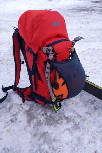 Die Trinkblase wird im dafür vorgesehen Fach verstaut und der Schlauch im Schulterträger vor dem Gefrieren geschützt. Besonders praktisch in meinen Augen ist auch die kleine Tasche am Hüftgurt. Hier bringe ich perfekt ein paar Energieriegel und die Kamera unter, so muss ich den Rucksack nicht ständig abnehmen, wenn ich ein Foto machen oder mal naschen möchte. Ich bin schlichtweg begeistert! Alles findet in den durchdachten Halterungen seinen Platz und das Sahnehäubchen ist die Zugriffsmöglichkeit über das Rückenteil. Bei kurzen Pausen habe ich es ständig genutzt, um zum Beispiel schnell an meine Semmel zu kommen oder fix eine warme Daunenjacke überzuwerfen. Geöffnet wird das Hauptfach per umlaufenden Reißverschluss. Damit die Zuglast auf den geschlossenen Zipper beim Gehen und Abfahren nicht zu groß wird, ist das Rückenteil noch mit zwei Steckschließen fixiert, die gleichzeitig die Spannung auf die Schulterträger regulieren – Millet denkt dabei neben praktisch auch noch langfristig!
