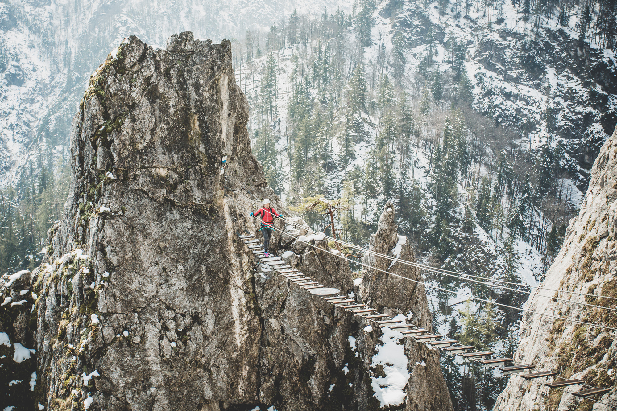 Wem das zu riskant ist bzw. wer noch nicht so viel Übung hat, entscheidet sich hier für die einfachere und wesentlich leichtere rechte Aufstiegsvariante, die „Franzosenschanze“. Diese punktet mit einer schwindelerregenden, aber fantastisch abenteuerlichen Hängebrücke. Die gut gesicherte und mit einer Einhängemöglichkeit versehene Seilbrücke kann auch als Highlight des Klettersteigs gewertet werden.