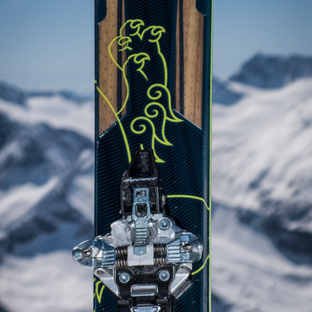 Es muss noch nicht einmal der Karton des Paketdienstes geöffnet werden, um einen Vorgeschmack des Cho Oyu zu bekommen – hochheben reicht! Mit seinen 1.160 Gramm (bei einer Länge von 174 Zentimetern) liegt der Tourenski in seiner Klasse gewichtstechnisch schon ganz weit vorne – ein K2 Wayback mit ähnlichen Abmessungen wiegt hier beispielsweise gute 200 Gramm pro Ski (!) mehr. Hier hat Dynafit schon mal alles richtig gemacht. Eine Mittelbreite von 88 Millimetern hat sich bei Allround-Tourenski über die letzten Jahre als bester Kompromiss zwischen Aufstiegstauglichkeit bzw. Gewicht und Abfahrtsperformance bewährt. Auch der Cho Oyu reiht sich mit Abmessungen von 125-88-111 (Schaufel-Mittelbreite-Tail) in dieses Testfeld ein. Hat man den Dynafit-Tourenski das erste Mal in der Hand, fällt zuerst die wertige Verarbeitung sowie der besondere Shape auf: Breite Schaufel mit durchscheinenden Carbon-Elementen und eher schmal zulaufendes Tail – beides mit Rocker, der vorn deutlich stärker ausgeprägt ist. Das Design des Dynafit Cho Oyu ist eher klassisch gewählt. Anstatt greller Farben dominiert Holzoptik kombiniert mit moderner Linienführung. Einem dezent neon-gelben Akzent in Form eines Drachens konnten sich aber auch die Dynafit-Designer nicht entziehen. Das gefällt!