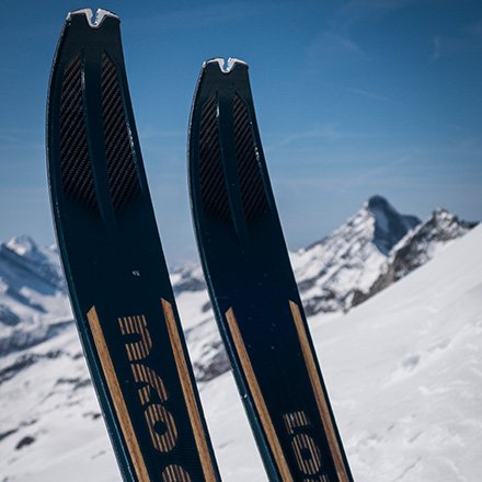 Bei einer Wettervorhersage für das Inntal, die mit knapp 20 Grad Celsius um die Mittagszeit schon frühsommerlich ausfällt, muss für einen ersten Cho Oyu-Test in größere Höhen ausgewichen werden: Der Hohe Riffler (3.231 Meter) in den Zillertaler Alpen soll es sein. Auch mit Gondelunterstützung als Halbtagestour machbar, starten wir am Parkplatz des Hintertuxer Gletschers. Das Anlegen der Dynafit Speedskin Felle funktioniert mit den integrierten Gummispannern problemlos. Was fällt auf im Aufstieg mit dem Tourenski? Nur Positives! Zu allererst natürlich das niedrige Gewicht – Kehre links, Kehre rechts, kein Problem! Mit der etwas nach hinten orientierten Bindungsposition gelingen Spitzkehren mühelos. Schnee hart, Schnee weich, egal! Das schlanke Tail des Dynafit Cho Oyu sinkt hier gut in den Schnee ein, was die Schaufel schnell an die Oberfläche treibt. In Kombination mit der montierten Dynafit Radical ST Bindung verlieren selbst Anstiege mit mehr als 1.500 Höhenmetern ihren Schrecken.
