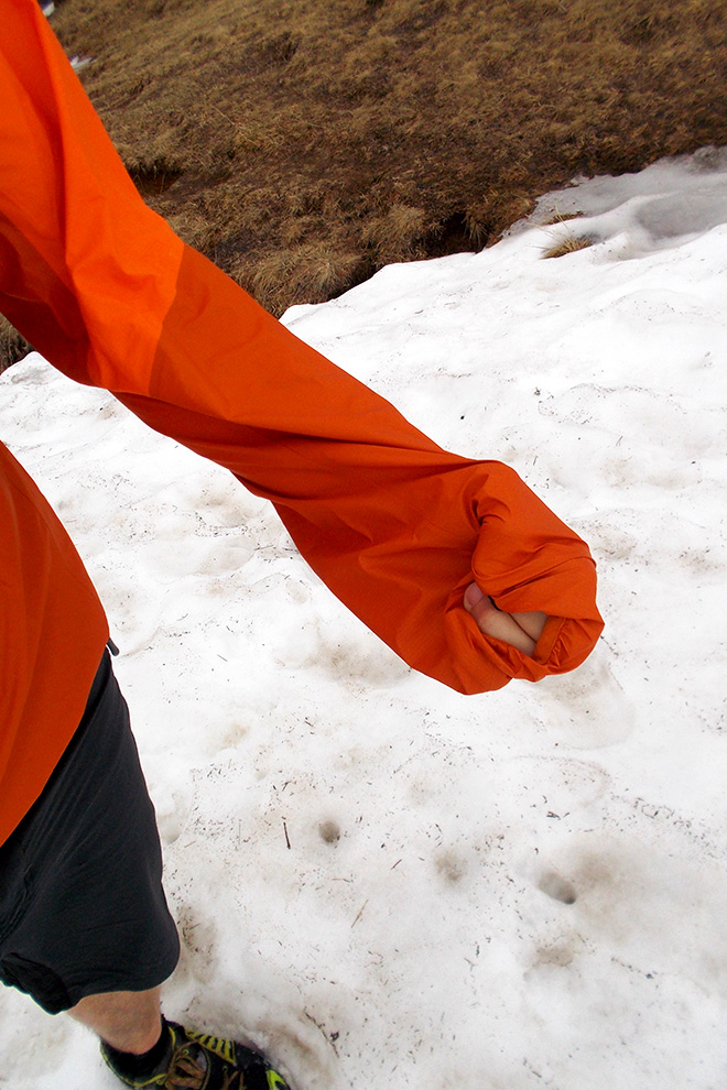 Die extreme Leichtbauweise hat aber auch einen Nachteil: Die Kapuze kann leider nicht enger gestellt werden. Was an sich bei einem Berglauf nicht so schlimm ist, da nur ganz selten die Kapuze wirklich benötigt wird. Wenn ich aber die Jacke als vollwertige Hardshell bei einer Hochtour verwenden möchte ist dies meiner Meinung nach ein Nachteil, da man immer in die Kapuze schaut, wenn man den Kopf dreht…