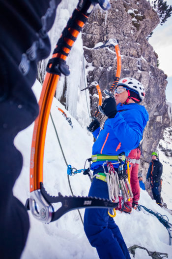 Zugegeben, es ist ein wirklich mauer Winter. Kaum Eis, ja nicht einmal richtig Schnee im Allgäu. Der heimische Bergführer und Camp-Athlet Luis Stitzinger fand dennoch Eis und das noch nicht einmal mit allzu langem Zustieg. Nach der Übergabe des neuen Equipments – immerhin für jeden Teilnehmer ein Paar nagelneuer X-Dream Eisgeräte und eine X-Gyro-Leash – ging es zu Fuß hoch zum Vilsalpsee. Eine kurze Einführung in die Eiskletter-Technik und los ging’s! Die Bergführer hatten alle Hände voll zu tun, neue Linien mit Topropes auszustatten, so motiviert waren die Teilnehmer.