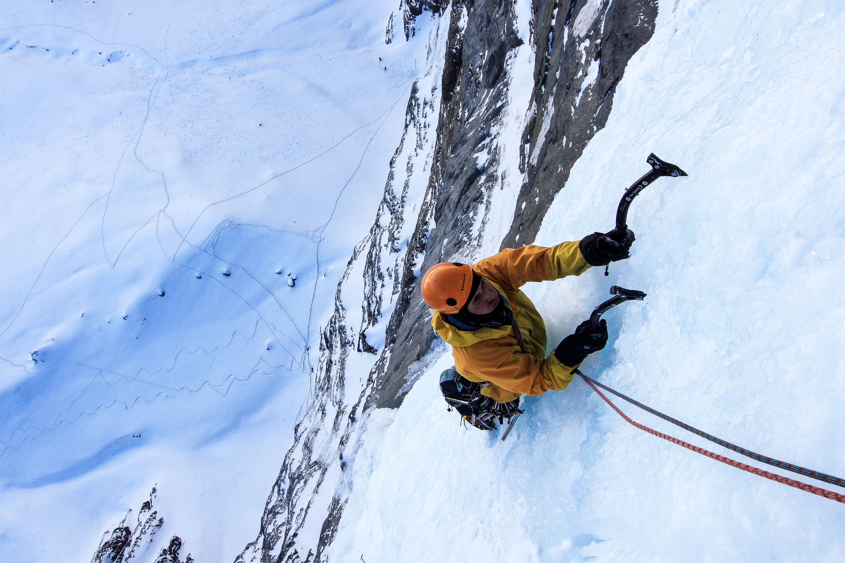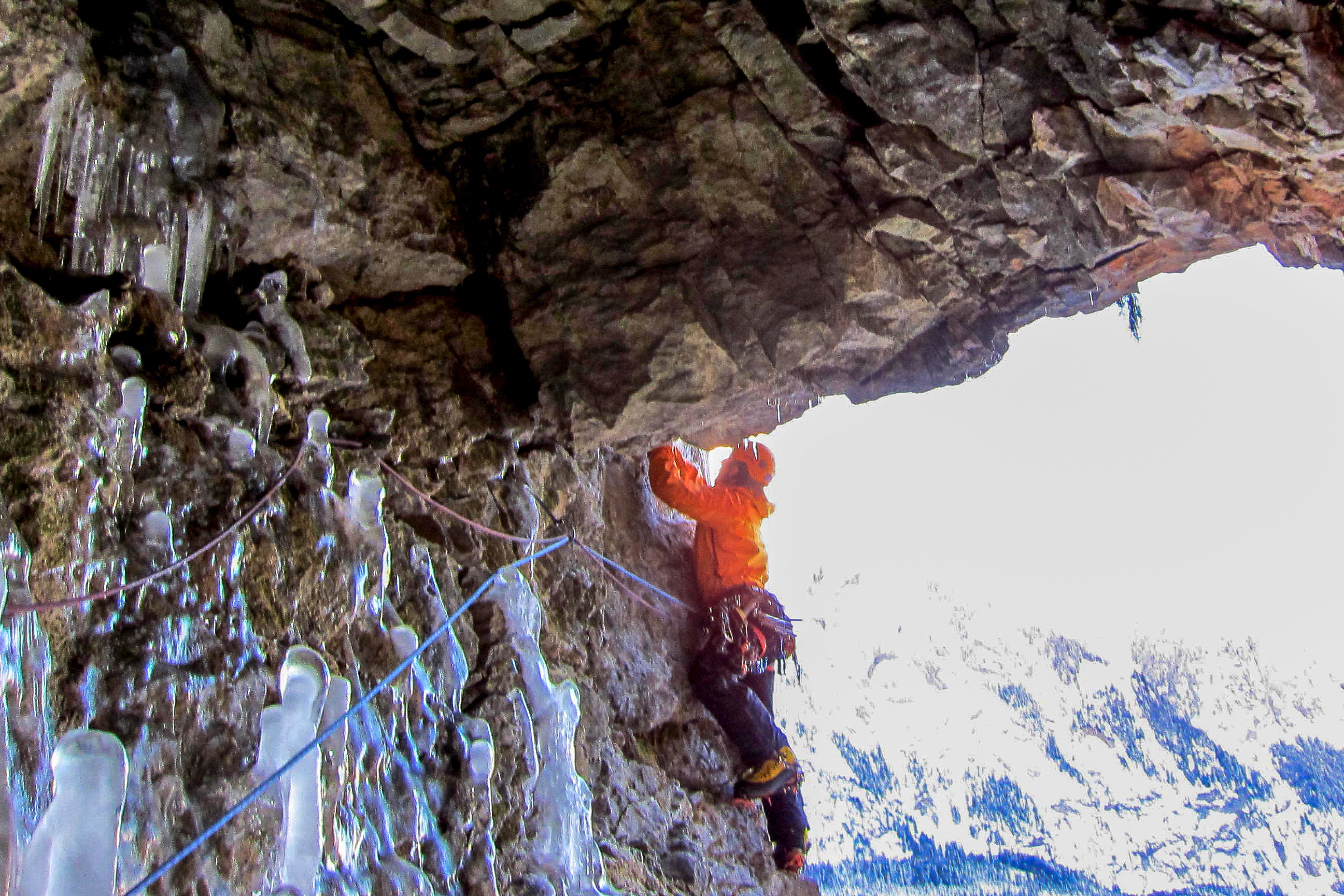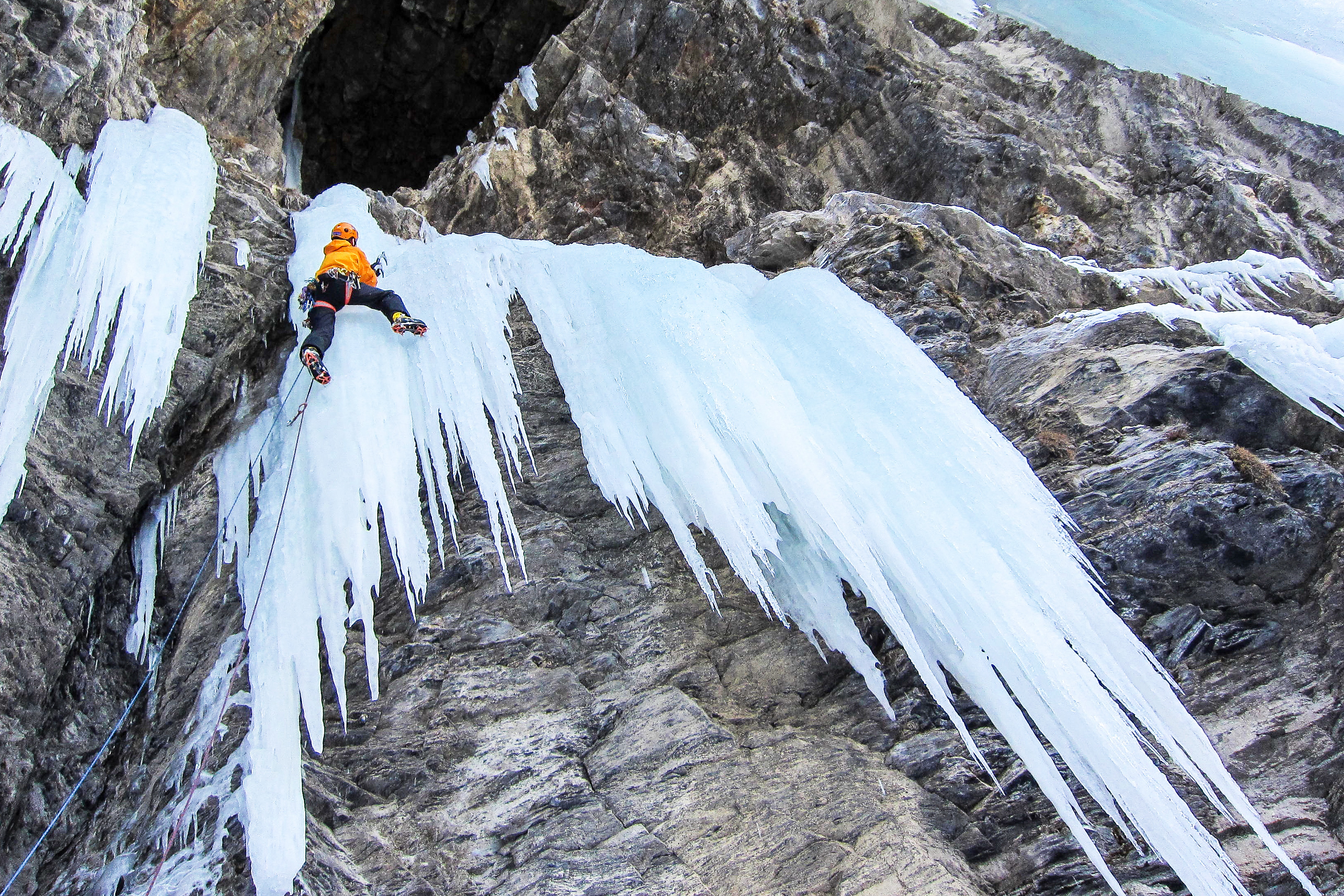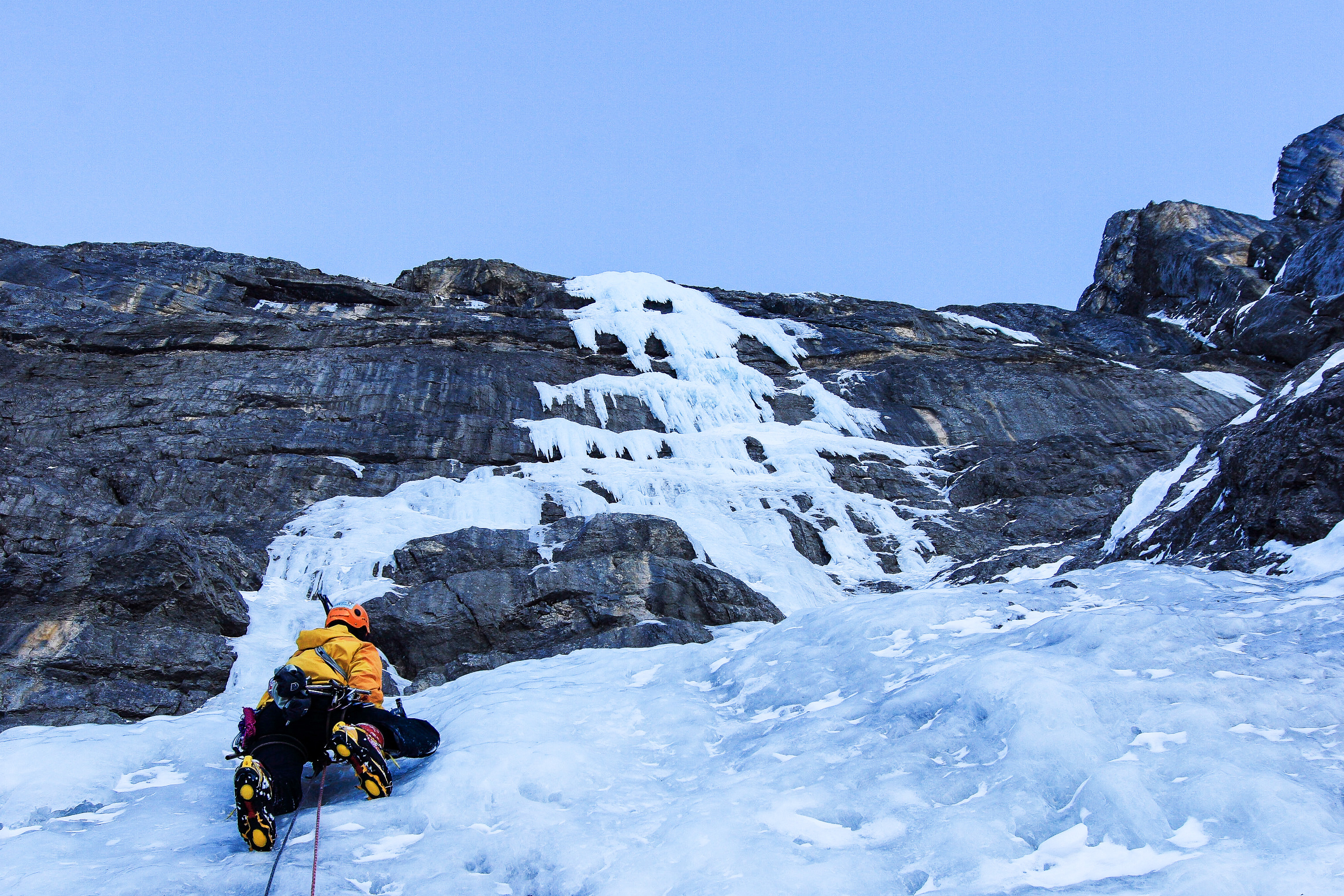 Zwischen dem schönen Bäretritt (WI5+, 70 Meter) und den bissigen Haizähnen (WI5+/6-, 180 Meter) kann man die wunderbare Reise ins Reich der Eiszwerge (WI6+.M6+, 175 Meter) antreten. Diese versammeln sich in einer Höhle vor der Traverse. Vorbei an niedlichen Eisskulpturen – bis erneut ein schöner Riss ins Eis führt.