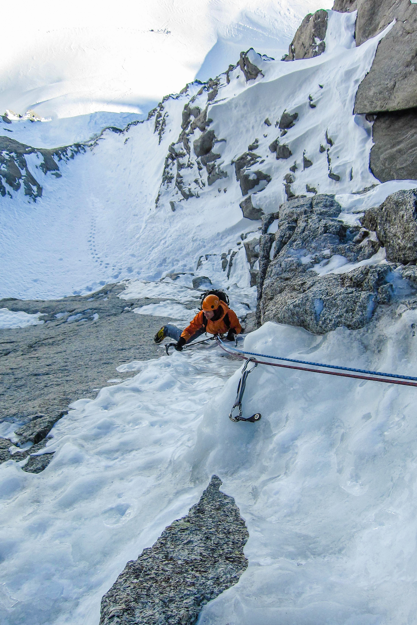 Jeder, der in solchen Touren unterwegs ist, wird sicherlich bereits seine eigenen Erfahrungen gemacht und seine persönliche Strategie zurechtgelegt haben. Aluschrauben sparen Gewicht, hier sollten kurze bis mittlere Längen mit dabei sein. Ergänzt werden die Eisschrauben durch Keile und Friends – oder umgekehrt.