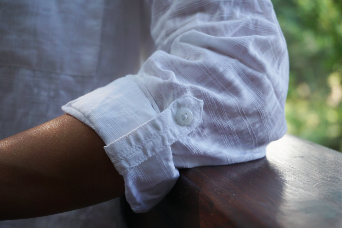 Ich habe mich für die Tunika Collette in Weiß und Größe S entschieden. Mir gefällt vor allem, dass man die Bluse auch im Alltag tragen kann. Die Bluse besteht zu 58% aus Baumwolle und zu 42% aus Lyocell (Tencel). Diese Mischfaserkombination ist sehr angenehm auf der Haut zu tragen und atmungsaktiv. Selbst bei über 30 Grad fängt man kaum zu Schwitzen an! Ein weiterer Pluspunkt ist das extrem schnelle Trocknen nach dem Waschen. Ich habe die Bluse während der Reise morgens durchgewaschen – und nachmittags konnte ich sie bereits wieder anziehen. Sie ist jedoch sehr durchsichtig, ich habe immer ein weißes Top darunter getragen. Ideal sind die langen Ärmel als wärmende Schicht für morgendliche oder abendliche „Game Drives“, wie die Wildbeobachtungsfahrten auch genannt werden. Sobald es wärmer wird, können die Ärmel aufgerollt und mit einem Knopf fixiert werden.
