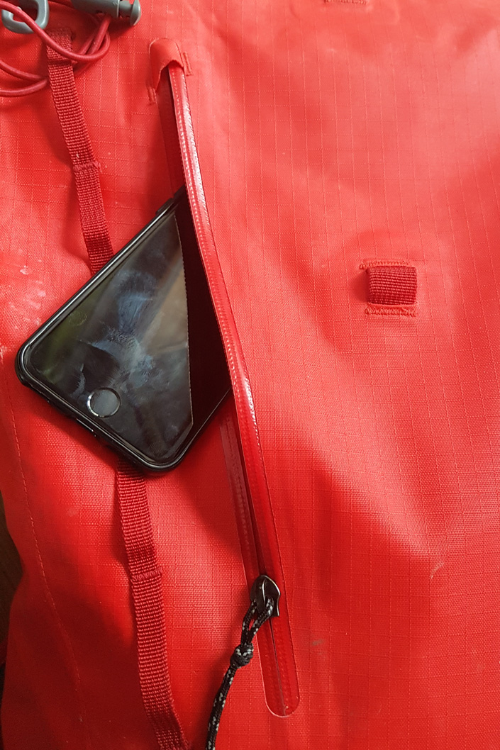 Die Aufteilung des Exped Black Ice 30 gestaltet sich zudem recht einfach. Er verfügt über ein großes Hauptfach – und ein praktisches Fach an der Vorderseite für alles, was man schnell braucht. Dieses Fach ist allerdings nicht 100% wasserdicht, da es per Reißverschluss verschlossen wird. An der Innenseite des Rucksacks befindet sich darüber hinaus noch ein Fach für kleinere Dinge, die geschützt werden müssen, also zum Beispiel Handy oder Geldbeutel.