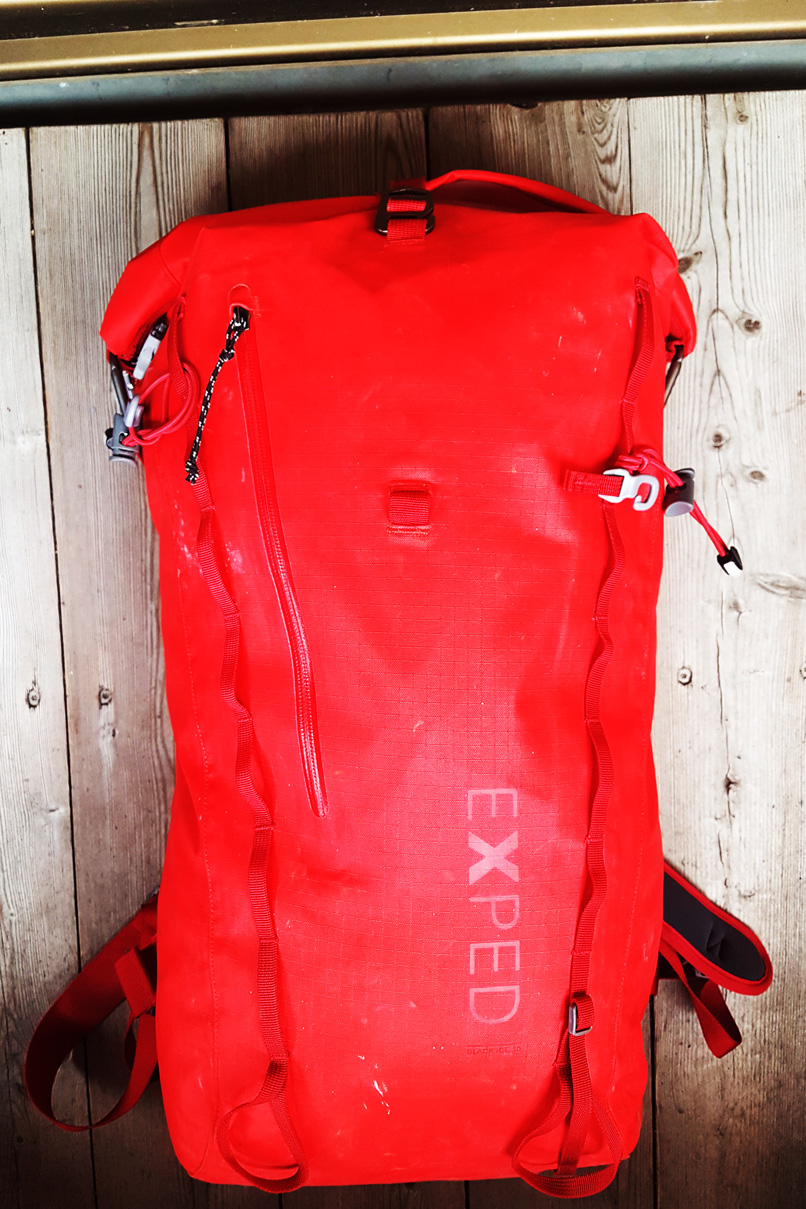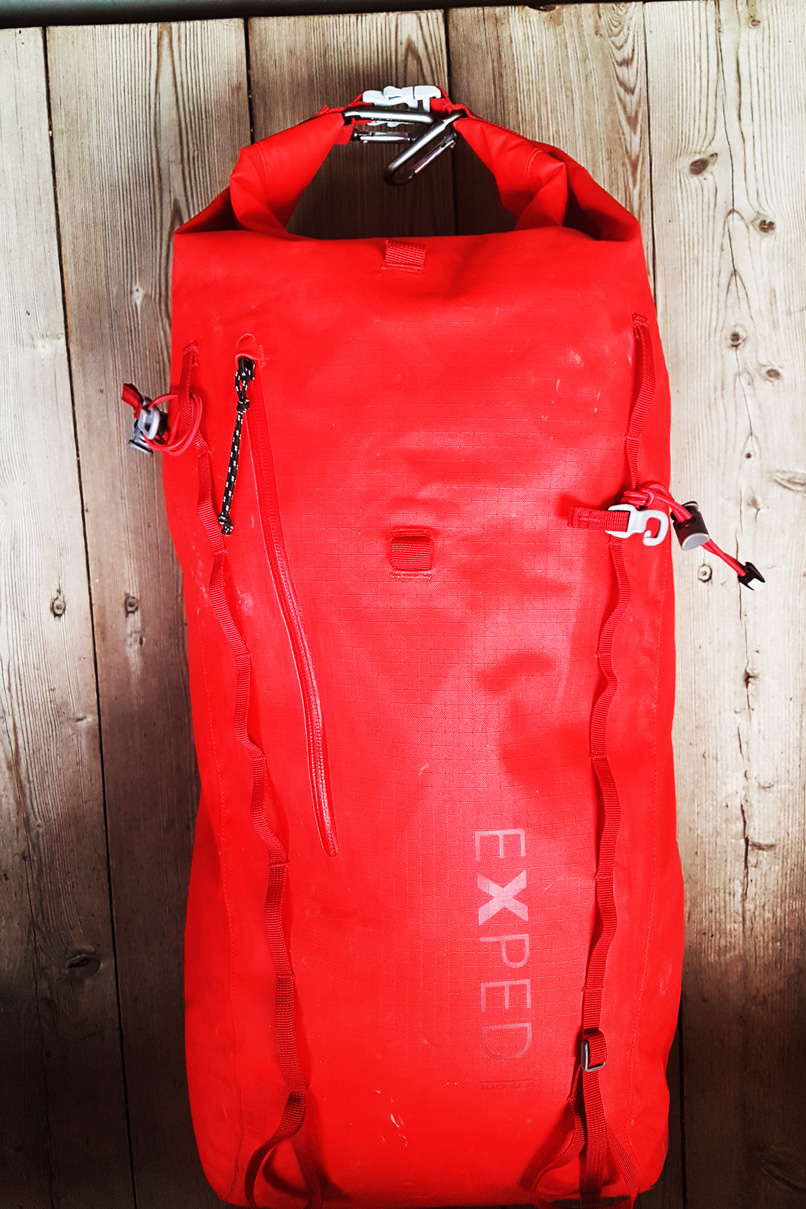 Im Exped-Produktsprech besteht die Black Ice-Serie aus „minimalistischen und federleichten Rolltop-Rucksäcken, die den hohen Ansprüchen des modernen Alpinismus und Höhenbergsteigens gerecht werden“ – das fällt schon beim ersten Blick auf den feuerroten Black Ice 30 auf.