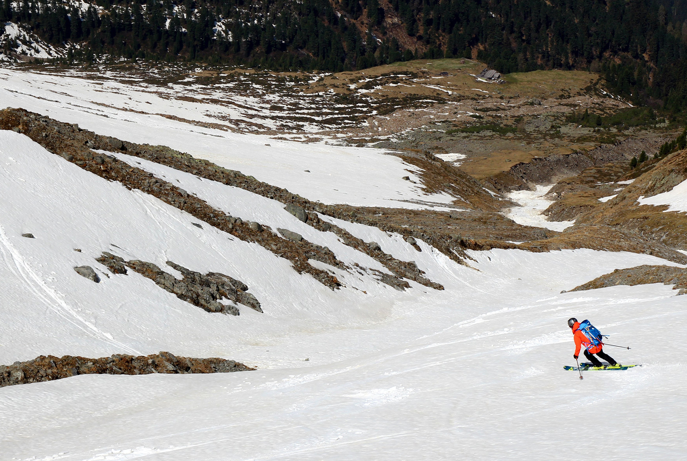 Bei hartem Schnee verwende ich nach wie vor lieber schmälere Tourenski. Im Aufstieg sind sie einfach angenehmer, weil man mit weniger Breite besser auf der Kante gehen kann und sich damit tausendmal leichter tut, wenn man steile, harschige Hänge begeht. Außerdem bringt jeder Millimeter mehr an Breite bei Frühjahrsbedingungen nichts – außer höherem Gewicht, höherem Fellwiderstand und einer schlechteren Abfahrtsperformance.