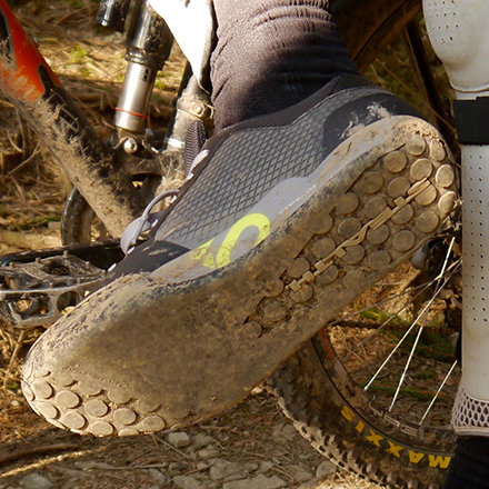 Die Sohle des adidas Five Ten Radschuhs besteht aus zwei Bereichen. Am Fußballen ist sie komplett glatt, ganz vorne an den Zehen sowie am Mittelfuß und an der Ferse befinden sich Kreise von circa einem Zentimeter Durchmesser. Die Stealth® Mi6 Gummimischung lässt sich wenige Millimeter eindrücken, sodass sich die Krallen eines Flatpedals darin einbohren können. Darunter ist sie sehr fest. Insgesamt ist die Sohle recht steif, was zu einer guten Kraftübertragung führt. Besonders der Mittelbereich des Freerider Contact ist extrem fest und lässt sich kaum verbiegen, was beim Stehen auf dem Pedal sehr angenehm ist.
