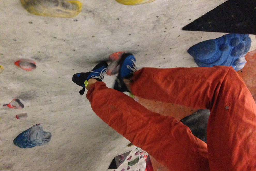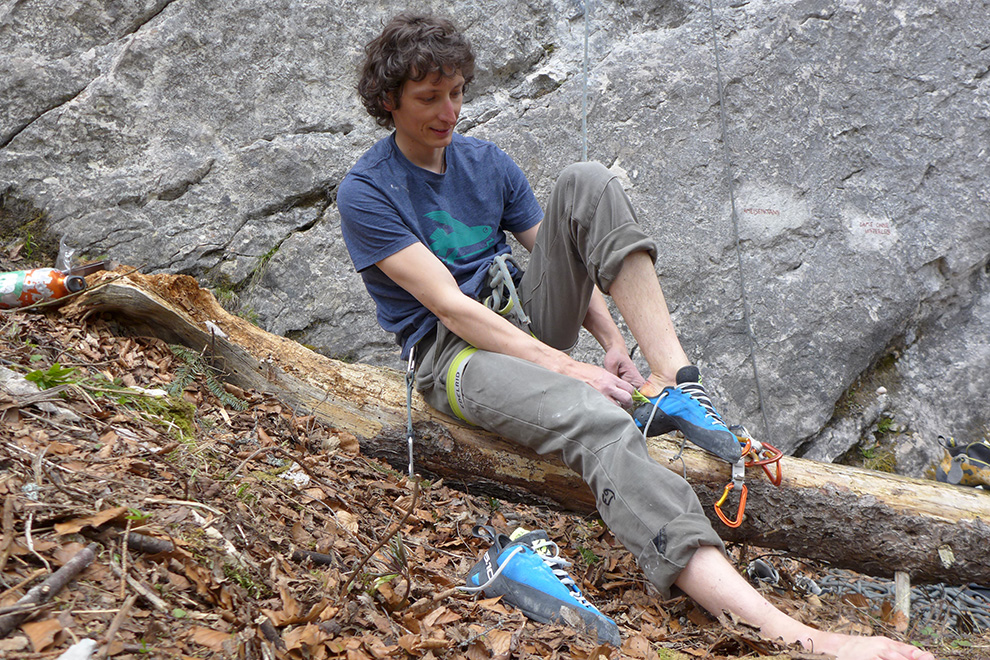 Zum Bouldern trage ich am liebsten weiche Schlappen. Draußen am Fels bevorzuge ich dann aber „richtige“ Kletterschuhe. Gerade nach längeren Draußen-Pausen fällt mir der Wechsel von meinen Hallen-Pythons auf „richtige“ Kletterschuhe oft eher schwer: Der Gummi klebt nicht so. Es fühlt sich immer ein wenig an, als würde man – überspitzt formuliert – von einem Ballettschuh in einen steigeisenfesten Bergstiefel wechseln.
