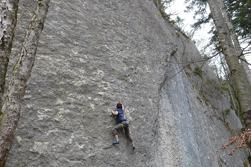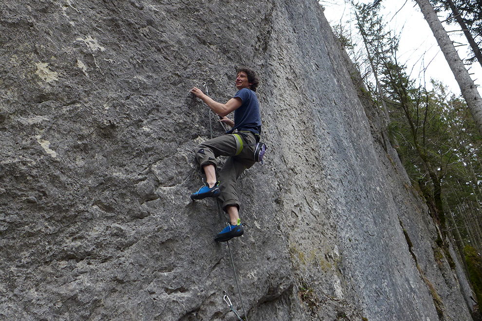 Anfang April müssen die Kletterschuhe zum Härtetest: 20 Meter senkrechte bis leicht geneigte Rauhfasertapete. Griffe und Tritte sind Mangelware. Was da ist, bewegt sich im Millimeterbereich. Ohne präzises Treten ist hier überhaupt nichts zu holen. Eigentlich ist das Gelände hier fast etwas zu flach für die Schuhe. Andererseits: kleine Tropflöcher und Leistchen, das sollten die Quantums ja können. Nach dem Klettertag kann ich das bestätigen: Auch auf diesem Kleinzeug sind die neuen Five Ten Quantum wirklich eine Wucht.