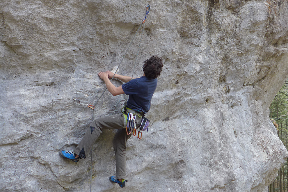 Lange Vorrede – kurzer Sinn: Mir wurde der neue Five Ten Quantum, seit März 2016 zu kaufen, zum Testen angedreht. Jetzt beäuge ich diese blauen Kletterlatschen etwas skeptisch. Etwas asymmetrisch, etwas Vorspannung haben sie. Mit diesem ersten Eindruck würde man also vermuten: ideal für leicht überhängendes Gelände, wo präzises Treten notwendig ist. Also genau die Kletterei, die ich am liebsten mag.