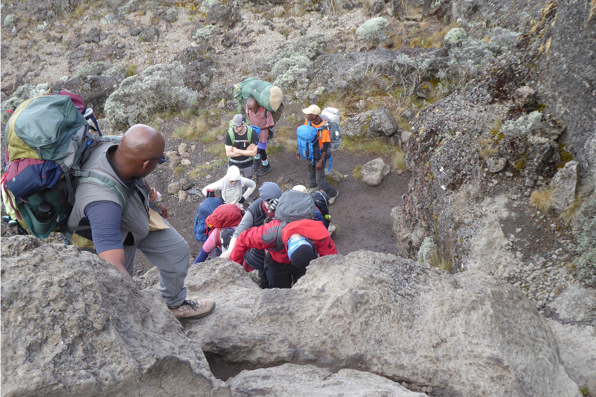 Der Blick wird nun frei, manchmal schon zum noch weit entfernten, eis- und schneeumhüllten Gipfelbereich. Wir haben die Alpine Wüstenzone erreicht. Schotter, Lavasand aber auch kompakter Fels mit leichten Kletterstellen bis zum zweiten Grad sind nun unsere Begleiter. Konzentriertes Gehen und Steigen ist hier gefordert, auch weil wir ja nicht hundertprozentig akklimatisiert sind.