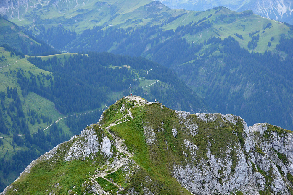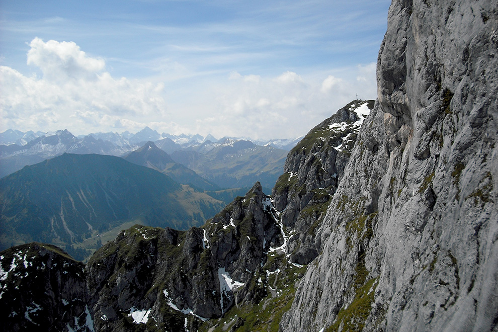 Das letzte Stück kurz vor dem Gipfel ist ebenfalls noch einmal knackig. Oben haben wir uns dann eine ordentliche Gipfelbrotzeit verdient und saugen den 360-Grad-Blick in uns auf. Hier sieht man erst einmal, wie weit der Nachbargipfel der Roten Flüh doch weg ist.