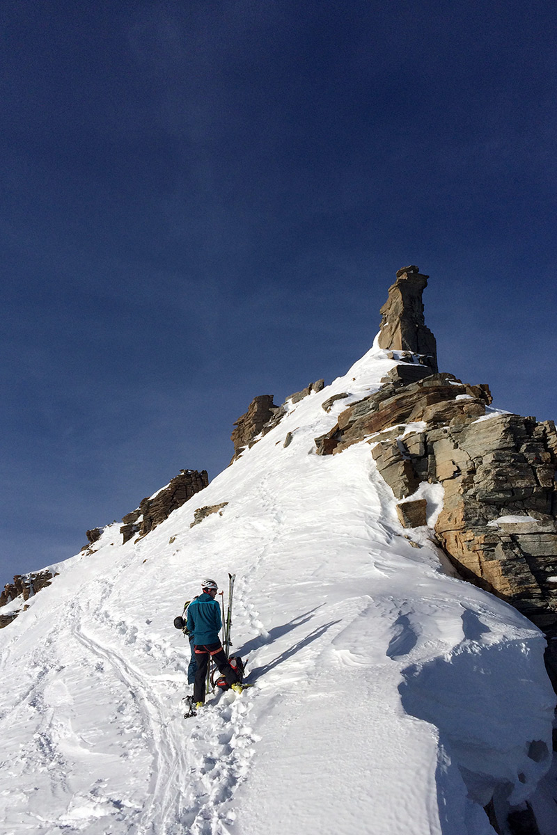 Der letzte sehr steile und meist auch etwas vereiste Aufstieg zum Gipfel des Gran Paradiso zieht sich dann in Richtung des nördlich verlaufenden Gipfelgrats. Spätestens hier wird das Skidepot errichtet, der Ausblick genossen und noch einmal kurz durchgeschnauft. Was nämlich folgt, ist der heikelste Teil der Skihochtour.