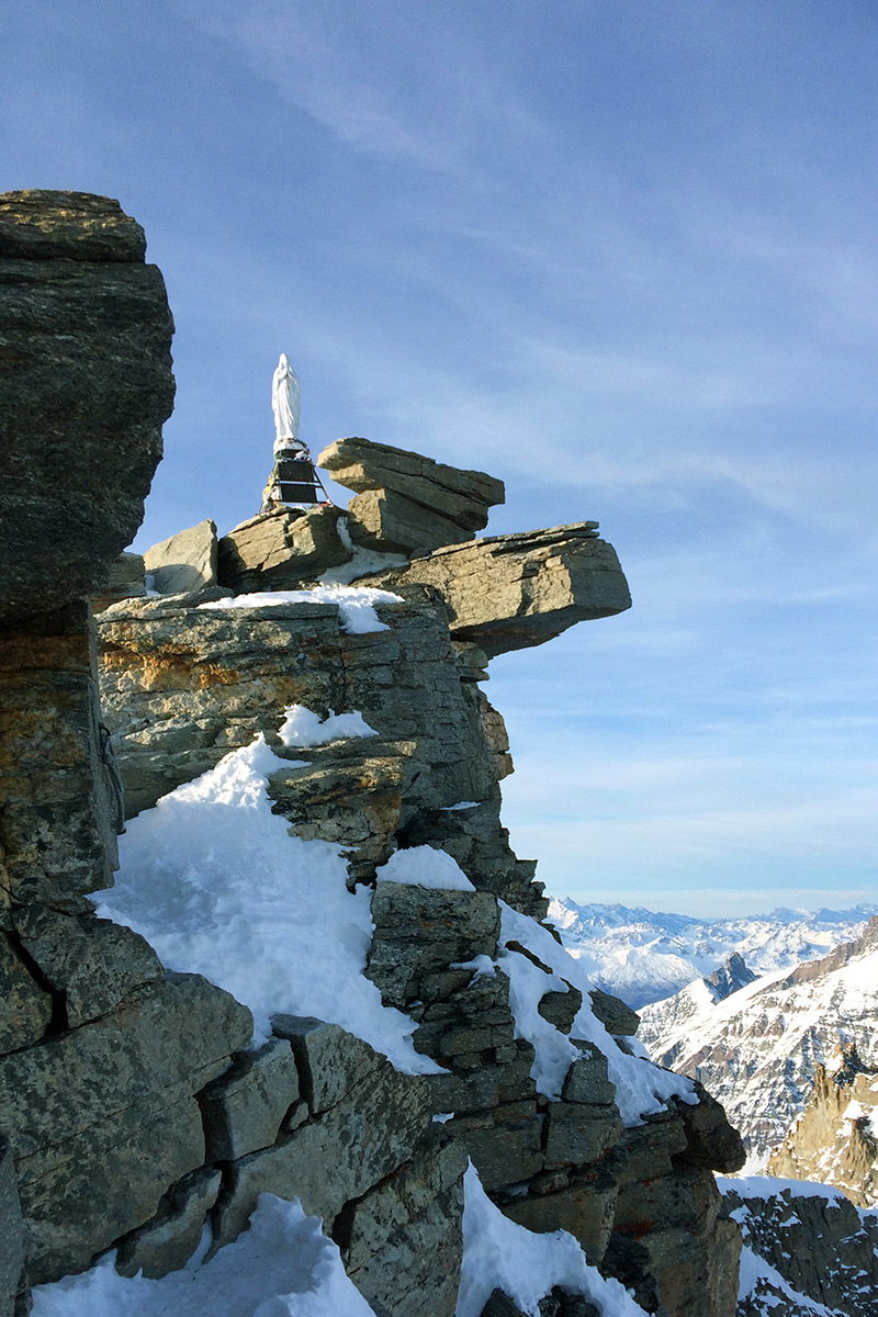 Die Felszacken und -blöcke im Gipfelbereich bieten eine luftige und ziemlich ausgesetzte, jedoch kurze Kletterei (UIAA II). Wir klettern los. Jetzt, auf den letzten Metern zur Madonna, die in ihrem weißen Kleid unschuldig und vom Klettergeschehen unbeeindruckt wartet, bieten zwei Haken Sicherung nach rund vier Stunden Aufstieg.