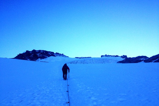 Am Anseilplatz kurz vor dem Gletscher laufen die hinteren Seilschaften wieder auf. Um Steigeisen, Gurt und Seil anzulegen, vergeht ein wenig Zeit. Gleichzeitig mit einem französischen Bergführer und seinen zwei Schützlingen geht es auf den Gletscher, der sich zunächst von seiner unangenehmeren Seite zeigt. Denn der erste Abschnitt ist etwa 36 Grad steil. Der Blick zurück zeigt den Anblick einiger Stirnlampen, die sich am Anseilplatz organisieren. Immer wieder ein schöner Anblick! Im ersten Teil des Gletscheranstiegs halten wir uns rechts an der erwähnten Schulter entlang, um den ersten Gletscherbruch zu umgehen. Nach etwa zwei Stunden Gehzeit sind wir weiterhin die vorderste Seilschaft. Die Nacht weicht der aufsteigenden Sonne, und ab etwa 3450 Meter können wir im Licht die ersten Blicke auf die Gipfelmadonna hoch über uns werfen.