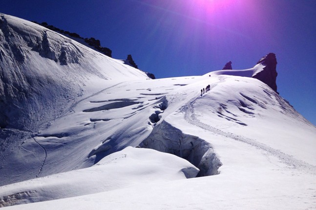 Schließlich steigen wir Richtung Nordosten dem Gipfelaufbau entgegen. Rechts von uns liegt die stark aufsteilende Flanke des Il Roc. Kurz unter dem Gipfelaufbau des Gran Paradiso müssen wir mittels einer Leiter die ca. drei Meter breite Randkluft überwinden. Kurz dahinter wechseln wir von Firn und Eis auf Eis und Fels. Ganz nach dem Motto: „Besser mit Stahl auf Fels als mit Gummi auf Eis“ behalten wir die Steigeisen an.