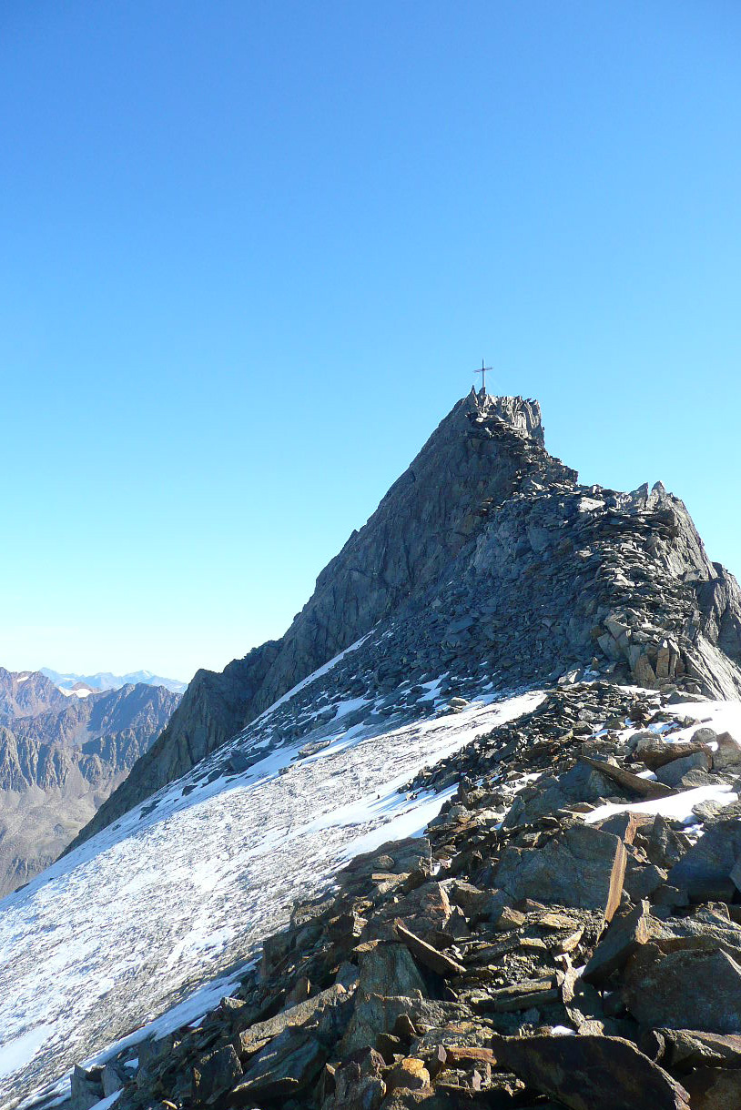 Entlang des oberen Randes der Hintere Schwärze-Nordwand erreicht man schließlich die schroffen Gipfelfelsen, die jedoch ohne größere Probleme (UIAA I) überwunden werden. Am schmalen Gipfel angekommen kann man sich rühmen, auf einem der etwas spektakuläreren, weil exponierten Gipfel der Ötztaler Alpen zu stehen. Trotz der sich verändernden Verhältnisse hat der Berg nichts von seiner Faszination und Anziehungskraft verloren – sommers wie winters.
