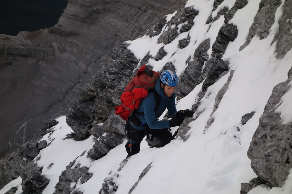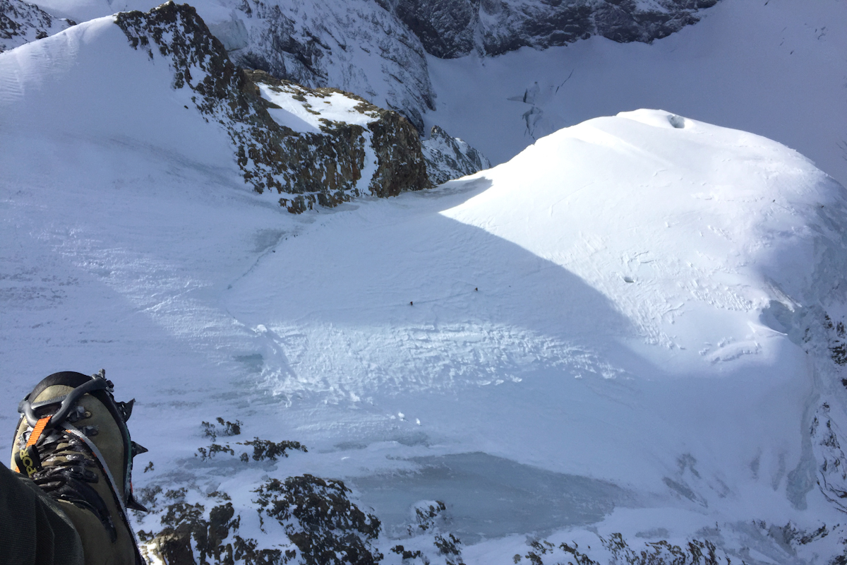 Uns pfeifen ganz schön die Lungen. Trotzdem machen wir uns schon nach kurzer Zeit an den Abstieg über den Normalweg. Dieser führt einen beeindruckenden Grat entlang und wird an einer Stelle von einer Wächte unterbrochen. Es gibt keine richtige Spur auf dem Grat, und so fordert der Abstieg in ausgesetzter Umgebung nochmal vollste Konzentration.