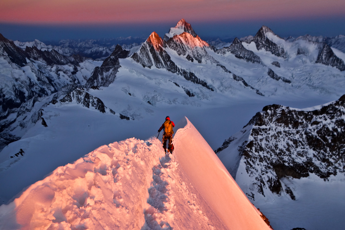 Aber nun stehe ich früh um fünf Uhr morgens ohne Akklimatisierung auf dreitausend Metern. Unter meinen Füßen knirscht abwärtsgeschichteter Schutt unter einer dünnen Schneedecke. Da es auf einer Bergtour immer wieder mal Momente gibt, die nicht so schön sind, freue ich mich, dass eben dieser kritische Moment schon vorbei ist. Wir erreichen das Mönchsplateau pünktlich zum Sonnenaufgang und können den Eisnollen aus der Nähe betrachten.