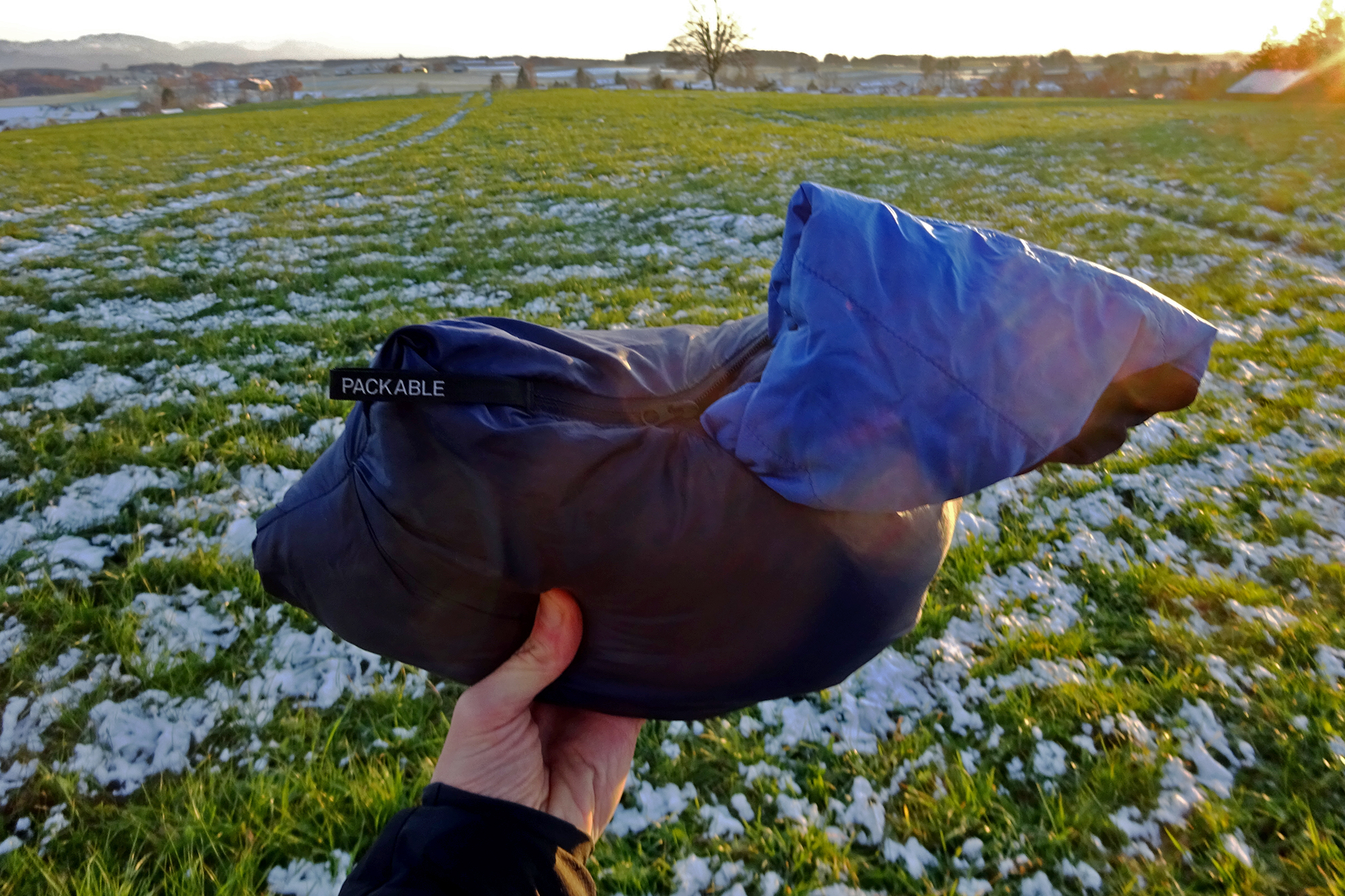 Das Erste was ich herausfand war, dass sie beim Anstieg auf die Sonnenspitze dann wirklich zu warm wurde. Allerdings kam mir hier gleich ein weiteres praktisches Feature der Hyperia Lite entgegen: Sie lässt sich in ihrer eigenen Innentasche verstauen. Dadurch reduziert sich die Jacke auf ein handliches Päckchen, das sich gut im Rucksack unterbringen lässt (und sich übrigens beim Reisen oder bei Übernachtungen im Zelt super als Kissen eignet, da es nicht zu straff gepackt ist).