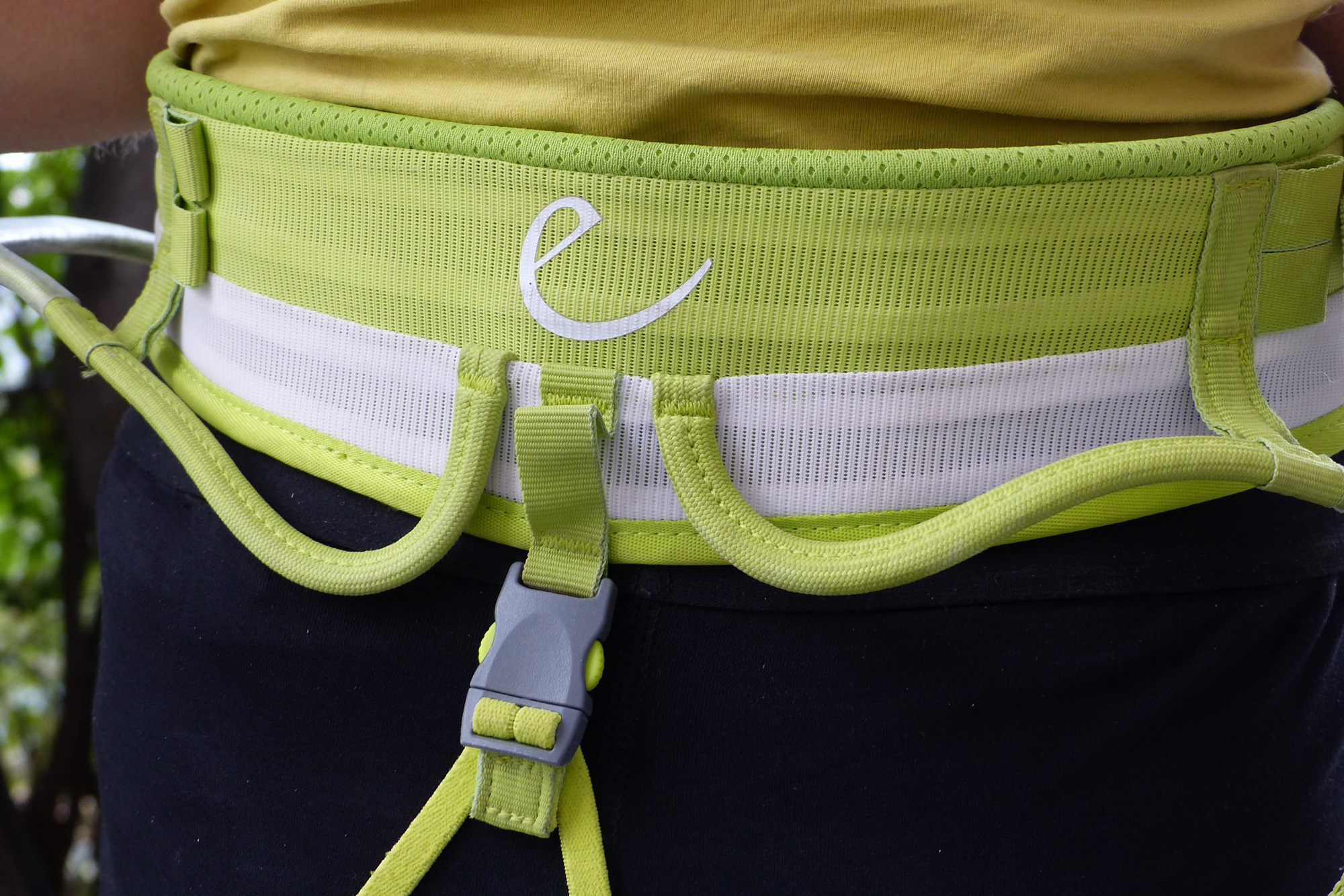 Das Farbdesign – komplett im typischen apfelgrün von Edelrid – ist schon mal ein echter Hingucker am Fels. Zur Ausstattung des Hüftgurtes lässt sich folgendes sagen:
