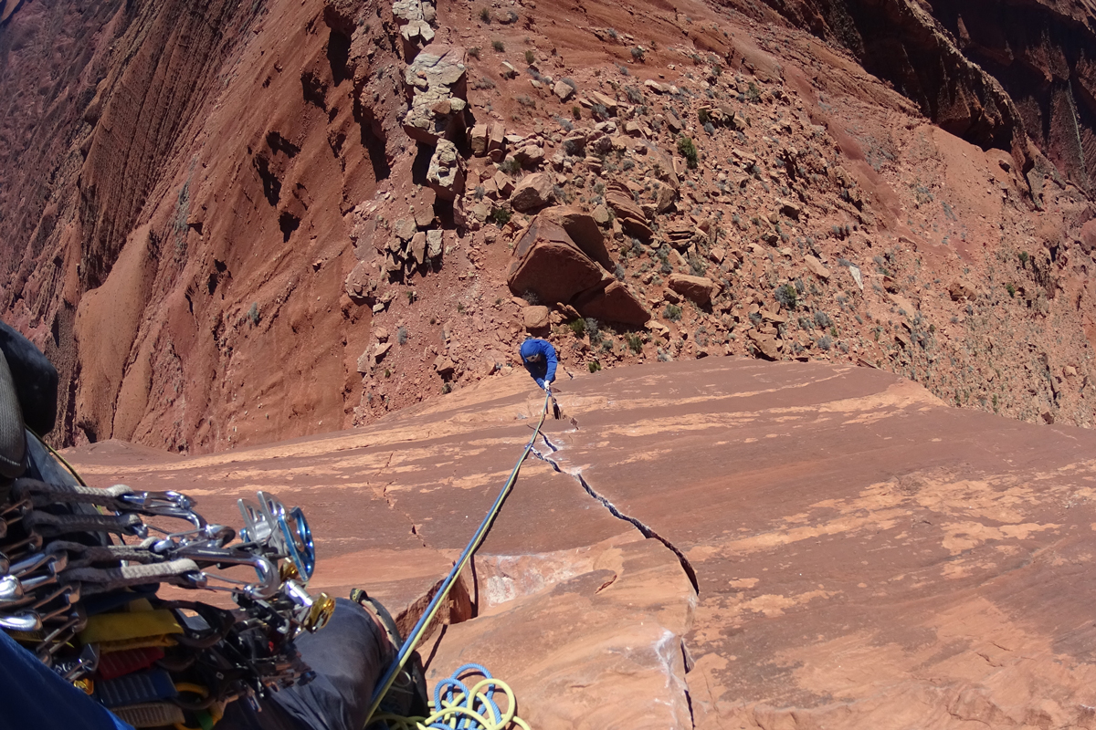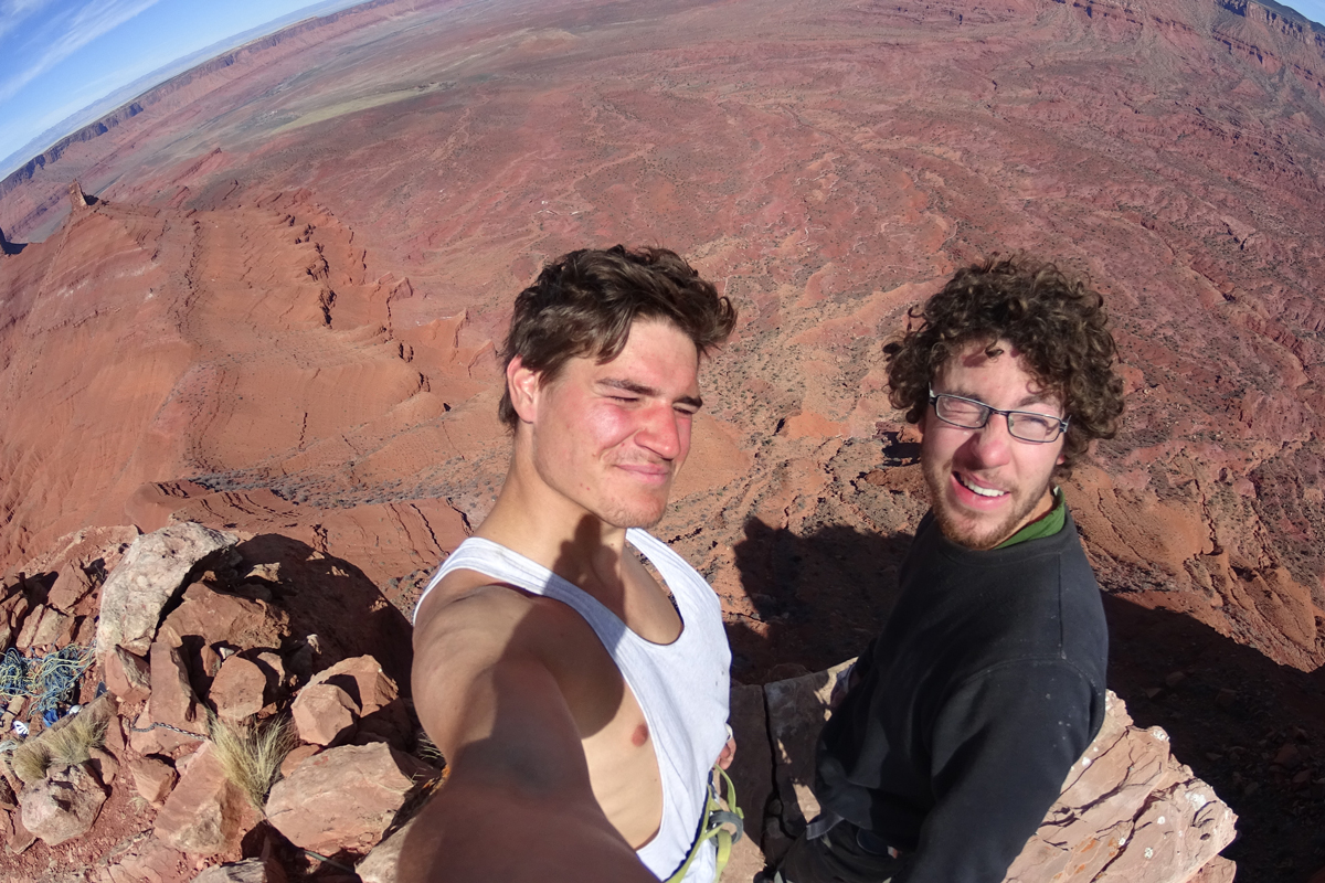 Als krönenden Abschluss klettern wir in der Gegend um Moab noch einige „dessert towers“. Und jeder einzelne legte die Messlatte des coolsten Gipfels noch ein wenig höher und höher. Diese Wüstentürme machen unbeschreiblich viel Spaß und sind definitiv eine Sache, die ich nur jedem Kletterer empfehle. Meinen „favorite summit“ der Zeit in Indian Creek steht bei den Fisher Towers. Den Felsen kann man eigentlich nicht als Felsen bezeichnen, es ist im Grunde nicht mehr als ein fester Sandhaufen, der sich irgendwie zusammenhält. Dieser Turm ist sehr bekannt, der „Stolen Chimney“, mit einem Gipfelplateau von 30 mal 30 Zentimetern.