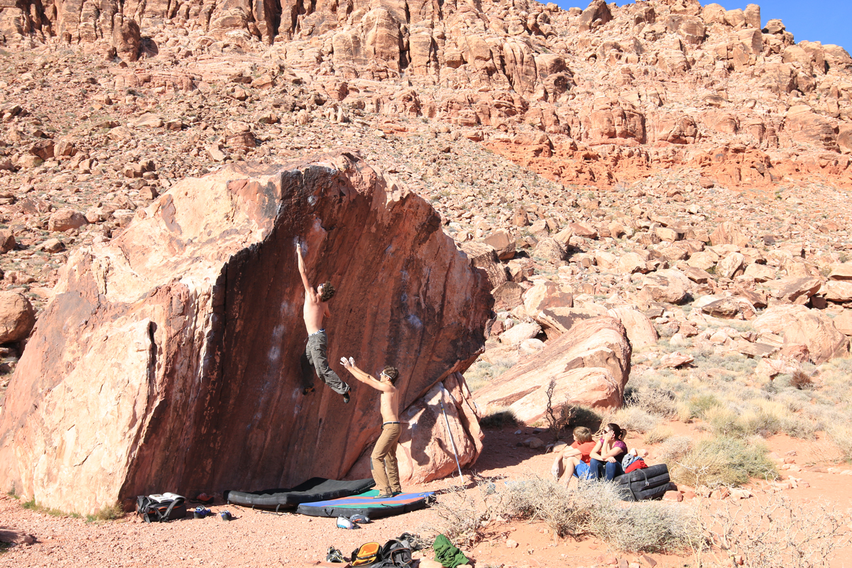 Den letzten Tag in den Red Rocks wollten wir noch eine beliebte Mehrseillängenroute auf einen markanten Pfeiler klettern. Das scheitert leider an den langsamen Seilschaften vor uns. Also planen wir nach einem Schläfchen in der Sonne um – und gehen lieber ein bisschen Bouldern. Ohne Crashpads ziehen wir also ins nahegelegene Bouldergebiet los, finden aber sofort Anschluss und haben einen richtig guten Abschlusstag in den Red Rocks beim Bouldern.