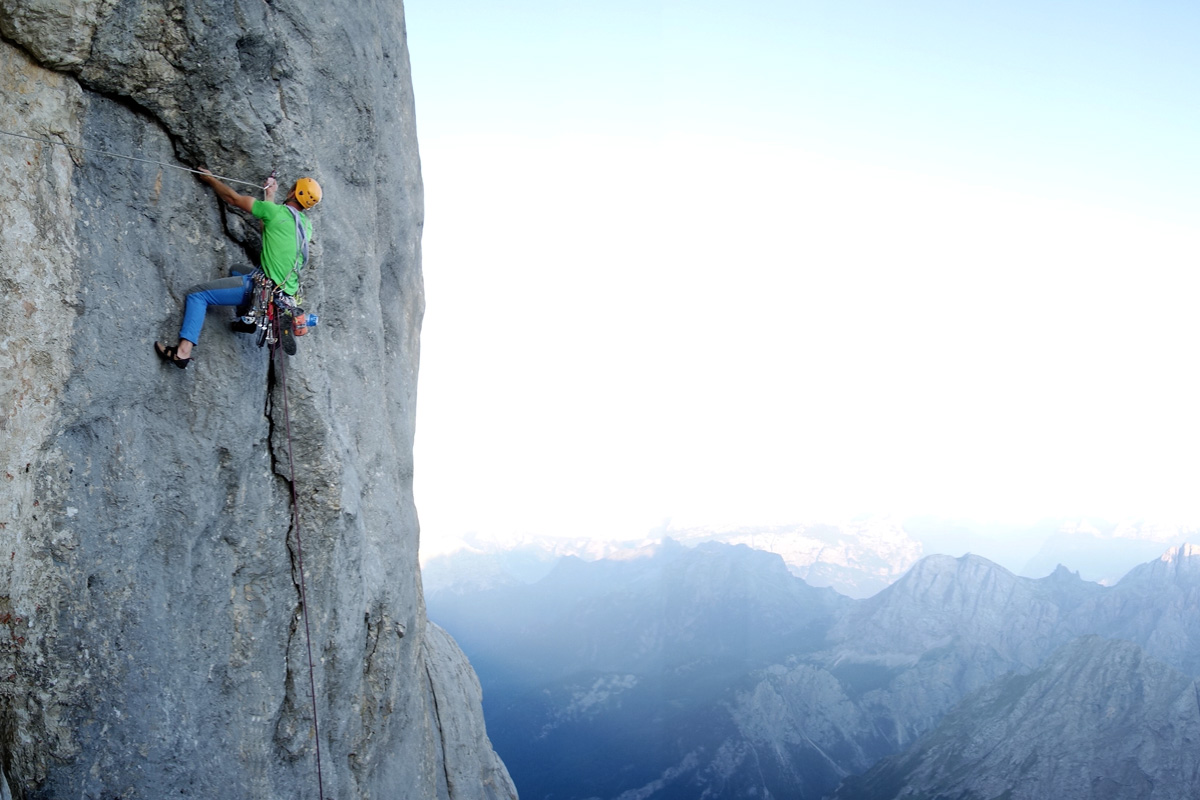 Die Schwierigkeiten sind im Fisch anhaltend, die Abstände zwischen mobilen Sicherungsmöglichkeiten oft weit. | Foto: David Lochner - Geschichte: 1981 von den Tschechen Igor Koller und Indrich Sustr erstbegangen. Nach vielen Jahren der Belagerung klettern Heinz Mariacher und Bruno Pederiva 1987 die Tour als erste Rotpunkt. Federica Mingolla gelingt in 2016 die erste Frauen-Onsight-Begehung. Natürlich zeitgemäß inklusive Kamerateam…
